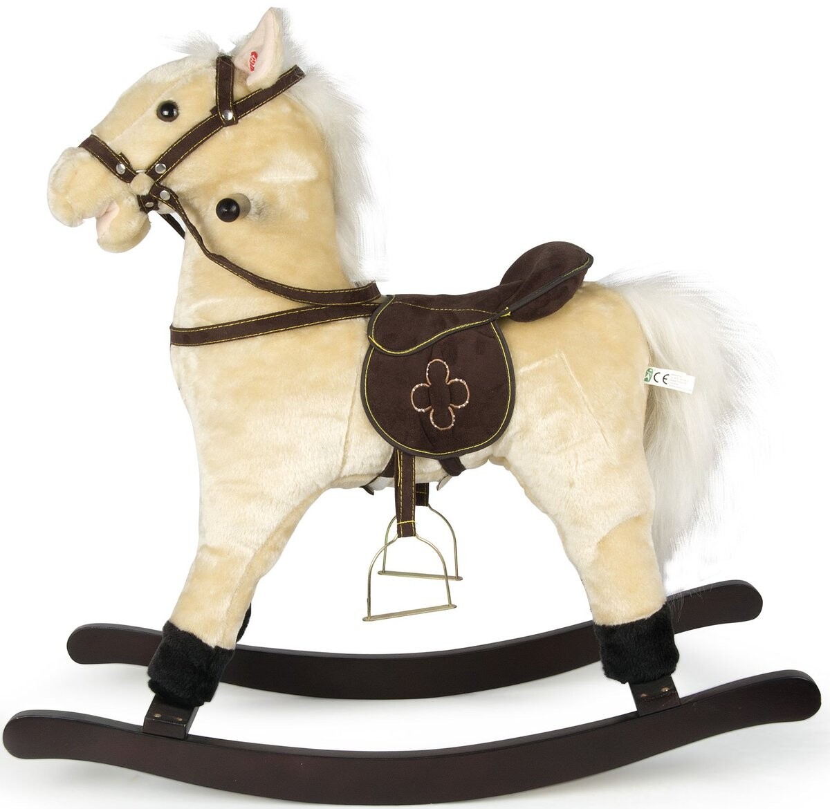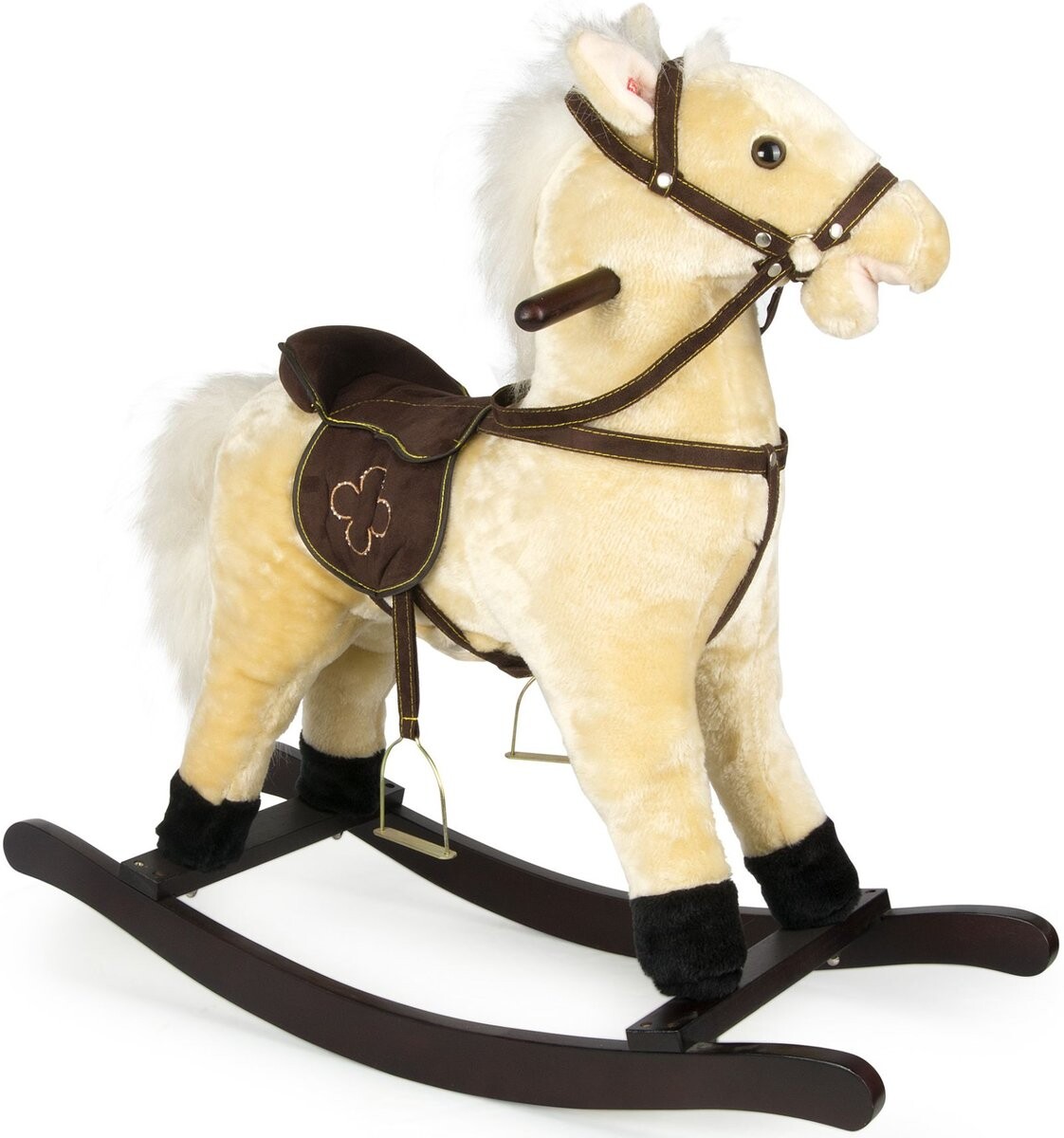 Традиционная лошадка-качалка, изготовленная из материалов высочайшего качества. Устойчивая и удобная жерди лошади изготовлены из дерева, а сама лошадь из мягкого плюшевого материала. У лошади пышная грива и хвост, и благодаря седлу, стременам и поводьям она готова к работе! Специальные ручки помогают сохранять равновесие. При нажатии на ухо лошадь издает звуки! РАЗМЕРЫ: Размеры лошади: 74 х 30 х 70 см. Высота от земли до верха седла: 45 см. ДОПОЛНИТЕЛЬНАЯ ИНФОРМАЦИЯ: Размеры упаковки: 57,5 (длина) х 19,5 (ширина) х 63 (высота) см. Вес: 3,5 кг.