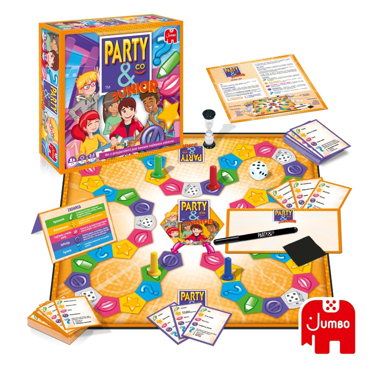 «PARTY & CO. JUNIOR — блестящая, уникальная и веселая игра! Она была разработана специально для детей от 8 до 12 лет. Задания и вопросы с двумя уровнями сложности, адаптированные к возрасту игроков, разработаны командой педагогов и воспитателей. . Вас и вашу команду ждут веселые испытания, и вашей задачей будет добраться до финиша и победить. Вас ждут 5 типов веселых заданий: рисование, подражание, чтение по губам, определения и вопросы. коробка: 112 карточек (более 1000 заданий и вопросов), одна доска, один кубик и 4 пешки, одни песочные часы, одна доска, один стираемый маркер, правила игры. Игра для 4-12 человек от 8 лет, продолжительность одной игры около 40. минут. Игра не требует батареек.