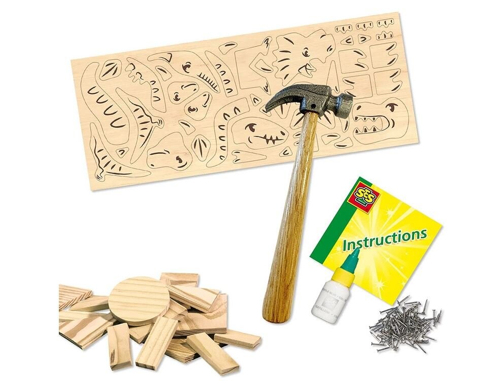 В комплект входят настоящий молоток, гвозди и готовые доски, чтобы сразу приступить к созданию фигурок доисторических существ!