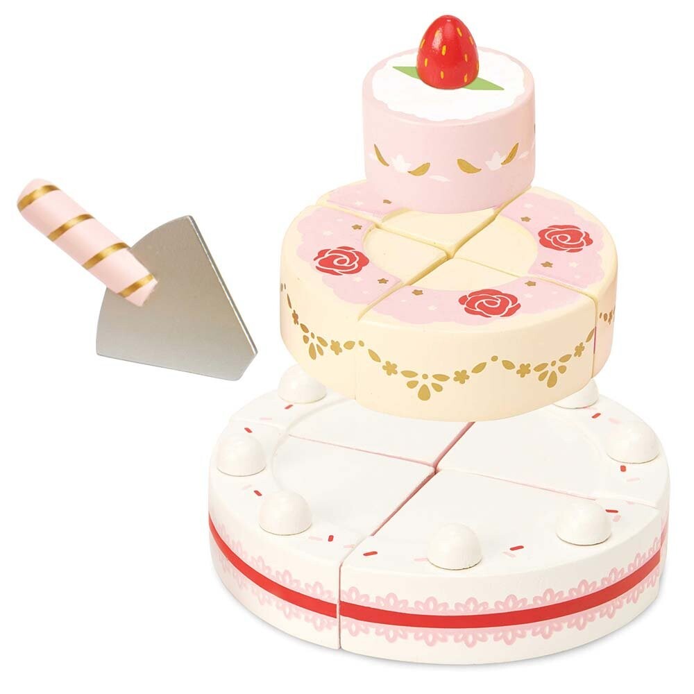 Нижняя и средняя части торта состоят из 4-х съемных частей (на застежках-липучках), что добавляет реалистичности во время игры, а также содержит лопаточку для сыра. Золотая отделка и клубничный верх добавляют очарования этому лакомству.