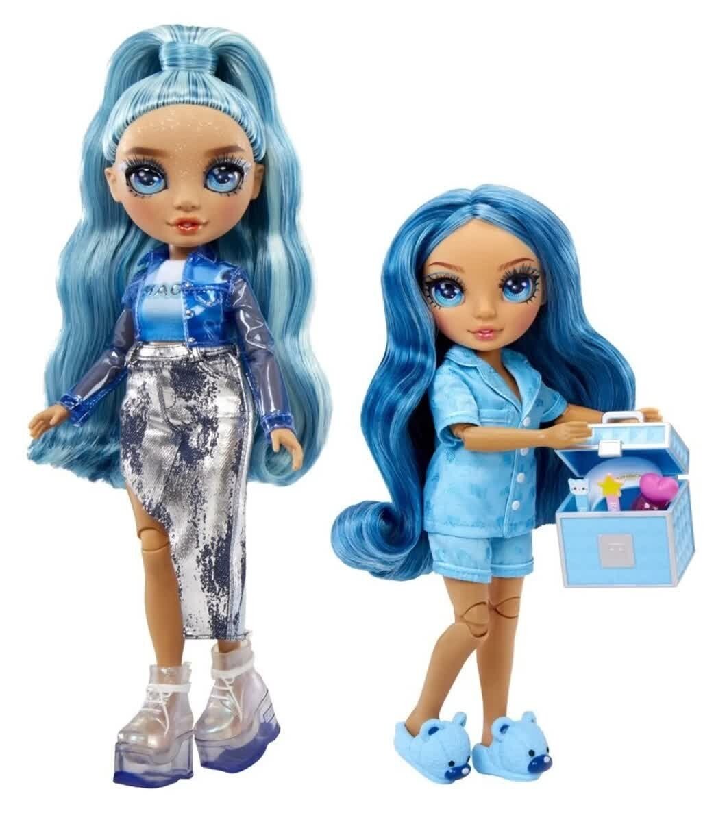 Скайлер носит очаровательную атласную пижаму, состоящую из двух частей, и синие тапочки с плюшевым мишкой в тон. У нее красивые длинные синие волосы с локонами. длинные ресницы и стеклянные глаза. Вайолет одета в милые фиолетовые брюки в клетку, мягкую футболку и тапочки в тон. У нее красивые длинные фиолетовые волосы с локонами, длинные ресницы и стеклянные глаза.