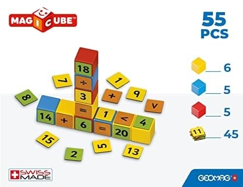 • В коробке находится набор элементов с цифрами, точками и символами, которые прикрепляются к кубикам с помощью магнетизма, а также книжка со схемами для детей от 3 лет.
