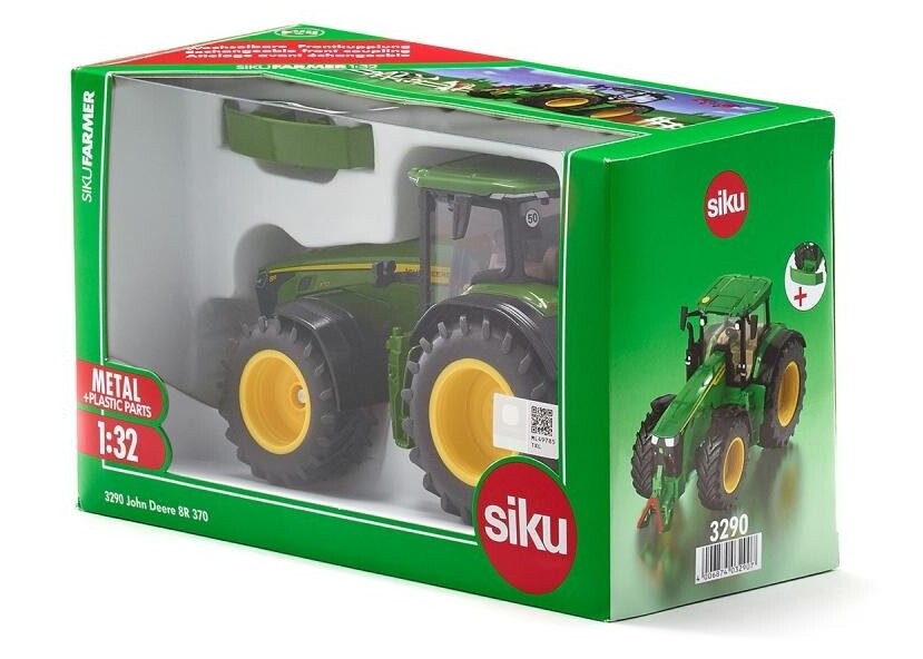 Массивный трактор с прыгающим оленем – John Deere 8R 370 – это мощный трактор в поле и трактор для комфортной транспортировки по дорогам. Этот большой трактор также впечатляет множеством деталей в модели 1:32. Теперь переднюю муфту также можно снять и легко заменить на входящий в комплект передний груз. В дополнение к функции задней навески это обеспечивает еще больше развлечений. Трактором можно управлять с помощью руля – достаточно снять кабину. Передний капот можно открыть, чтобы увидеть мощный шестицилиндровый двигатель.