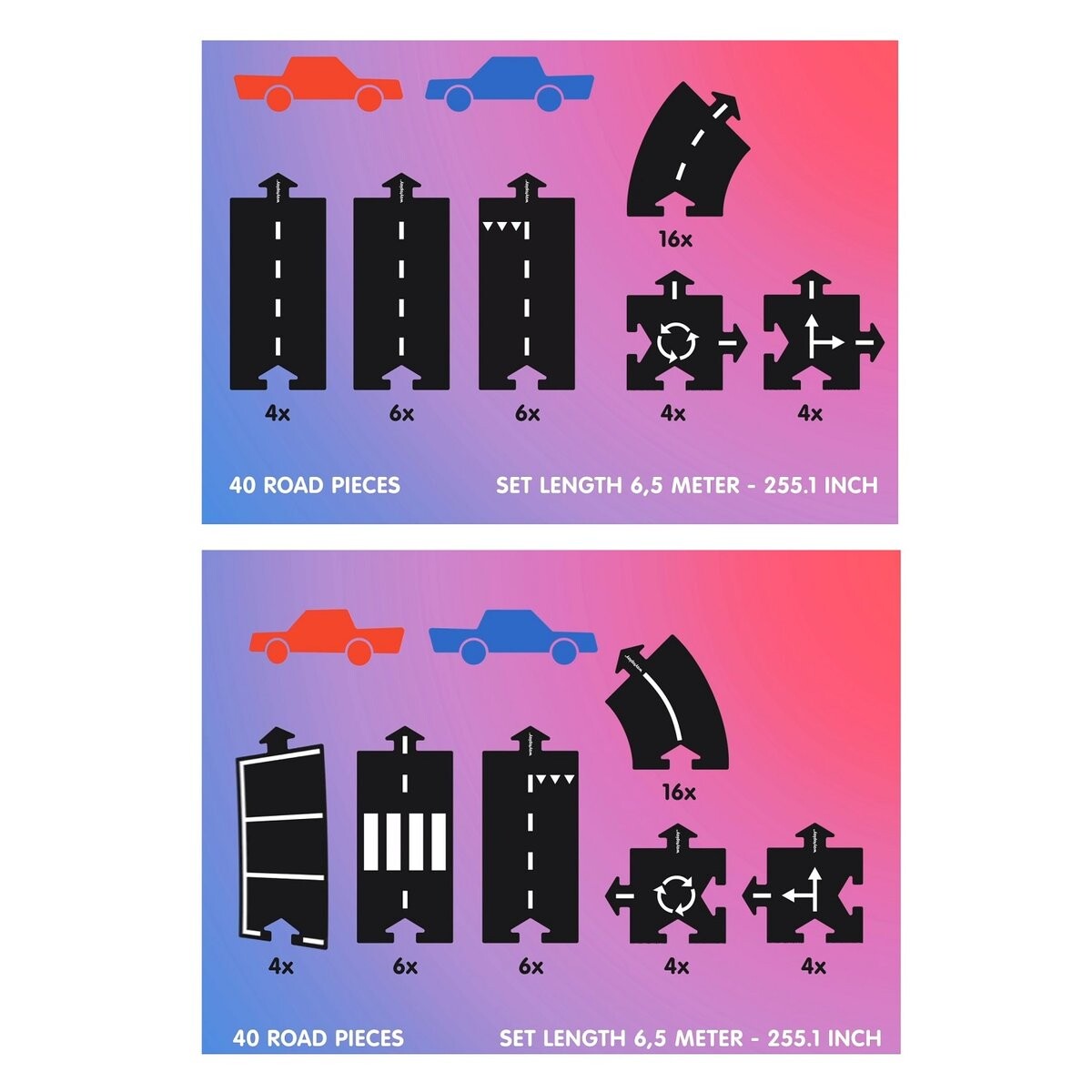 Набор состоит из 40 дорожных элементов и двух автомобилей. Это классический набор King of the Road с дополнительными игровыми машинками. Он предлагает множество возможностей для создания игровых дорожек общей длиной 648 см! Он будет хорошо работать дома и на природе, его можно использовать в различных условиях – на песке, снегу и даже в ванне и бассейне! Элементы из гибкой резины легко моются, а в сложенном виде занимают мало места. Пазл побуждает ребенка к творческой игре. Совместима с другими наборами WayToPlay.