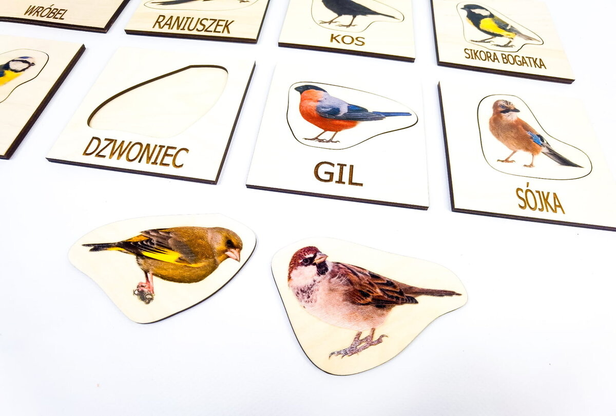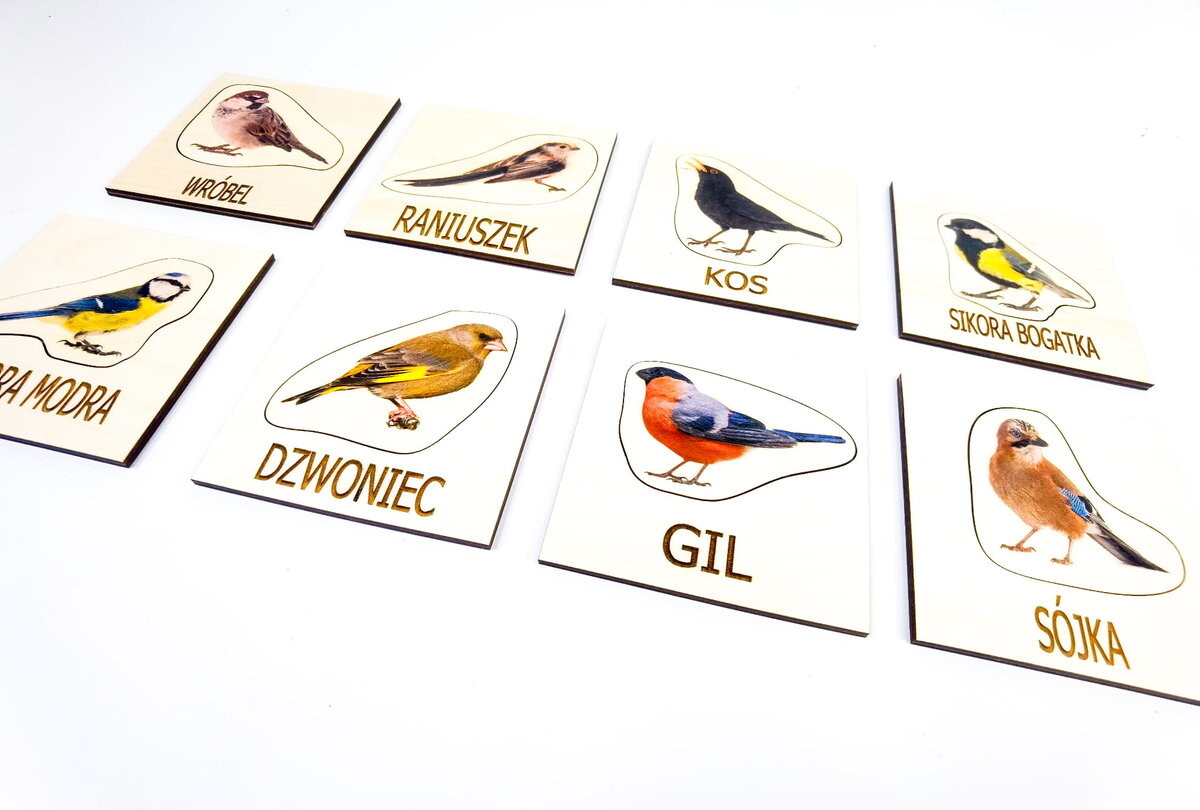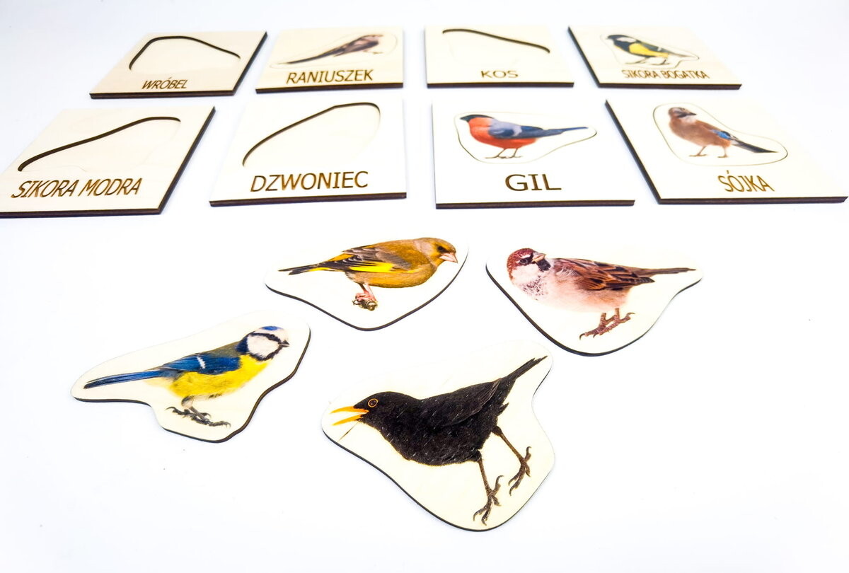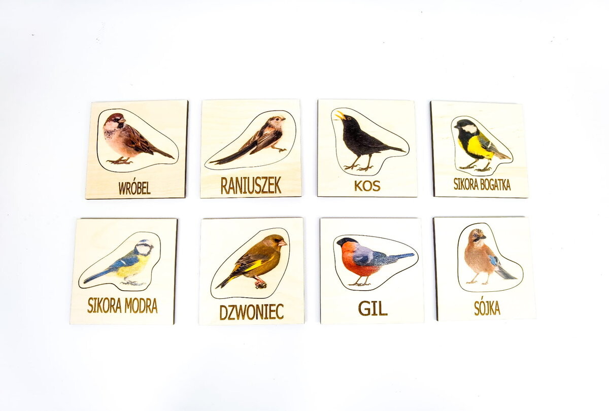 - Птицы с подставками:8 деревянных птиц, каждая на подставке с именем. В наборе вы найдете следующие птицы: