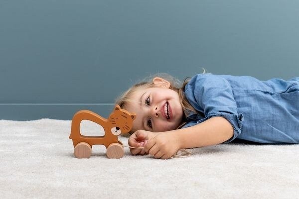 Эта очаровательная игрушка будет сопровождать вашего малыша в его первых самостоятельных шагах. Благодаря хлопковой веревке дети смогут вытащить любимое животное на прогулку. Отверстие посередине позволяет детям легче брать и перемещать игрушку.