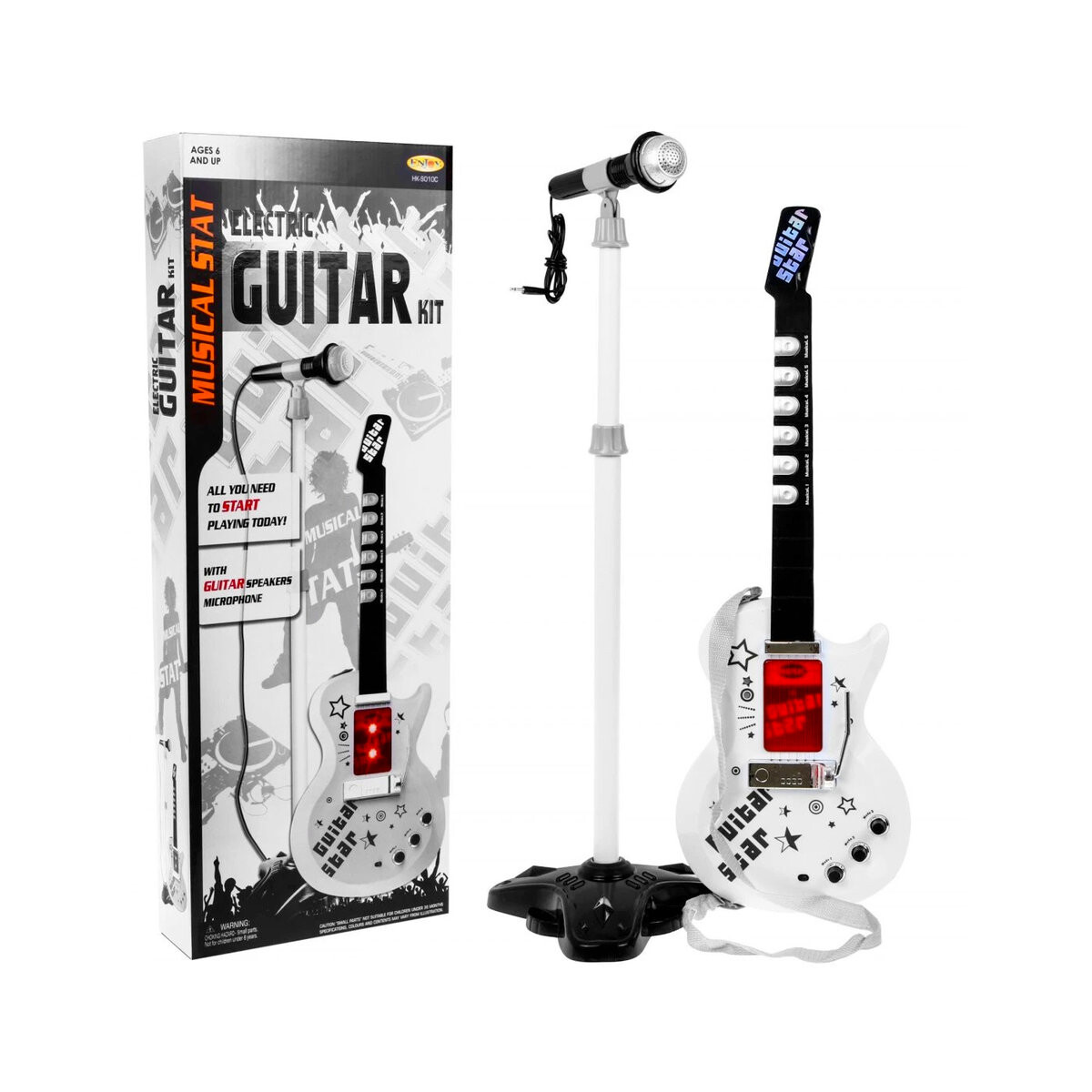 Уникальная электрогитара для будущего гитариста с микрофоном в комплекте. Гитара — чрезвычайно вдохновляющий музыкальный инструмент из группы щипковых струн, играющий чрезвычайно важную роль в блюзе, кантри, фламенко, роке и многих формах поп-музыки. Уже в первые годы жизни ребенок проявляет интерес к игре в игрушки, танцует, поет, пробует играть на простых инструментах. Наличие музыки на развитие ребенка оказывает однозначно положительное влияние. Талант, раскрывшийся на такой ранней стадии, имеет шанс существенно развиться в будущем, поэтому этот момент нельзя упускать. Если ваш ребенок смотрит на гитаристов с невообразимым восхищением, изображает игру на воображаемой гитаре и обладает чувством ритма – возможно, у него есть талант к игре на любой гитаре. Игрушка оснащена 6 металлическими струнами и 3 гитарными тембрами. 7 мелодий и 12 коротких соло. В комплекте: - гитара с регулируемым ремнем (питание от 3 батареек АА 3 х 1,5 В - не входят в комплект), - микрофон с усилителем голоса, - регулируемая подставка (2 уровня), - регулировка уровня микрофона, - кабель MP3, Размеры: - гитара в порядке. . 70 см х 24 см х 4 см, - микрофон прибл. 20 см х 5 см, - штатив от ок. от 64 до примерно 110 см,
