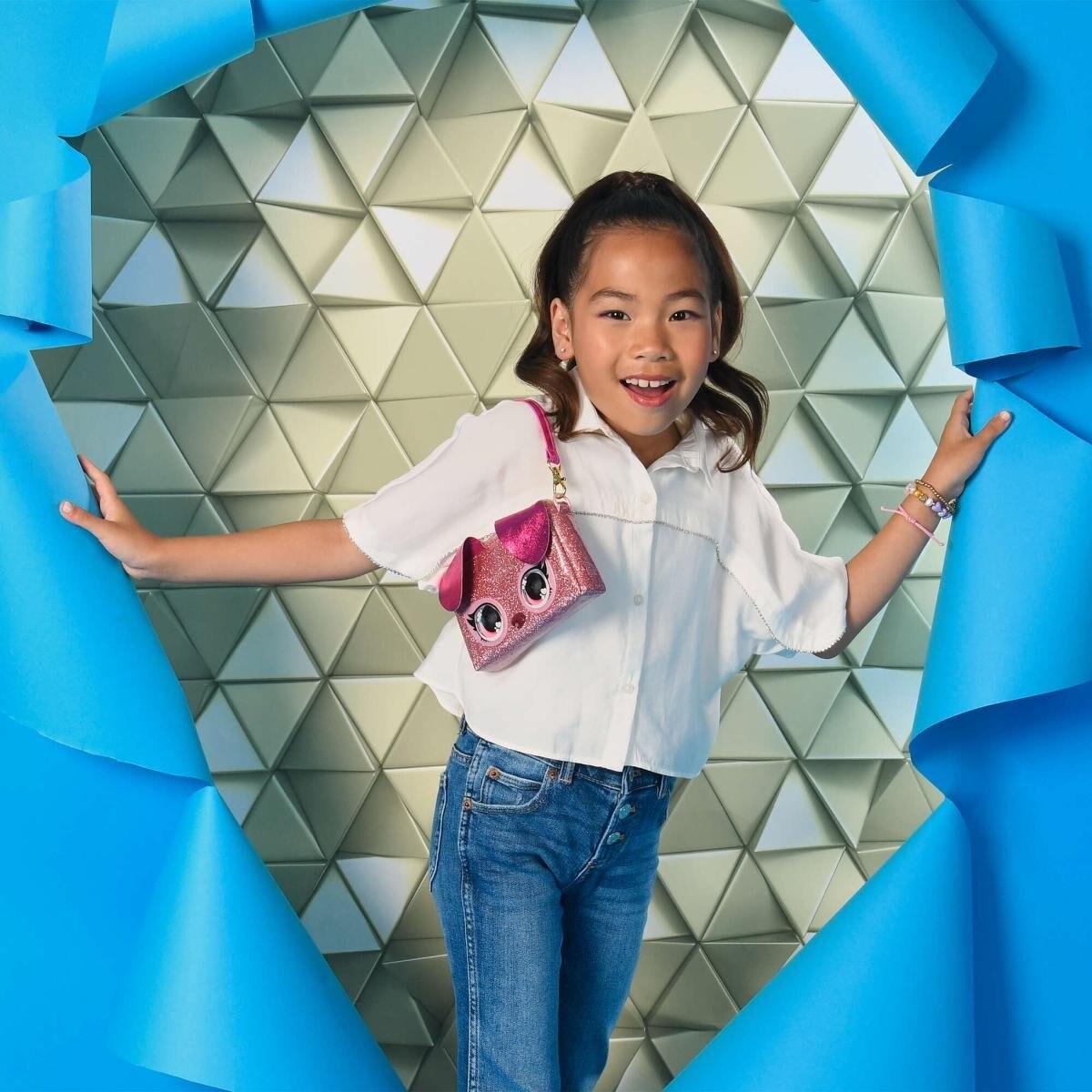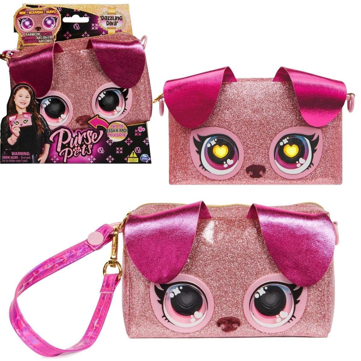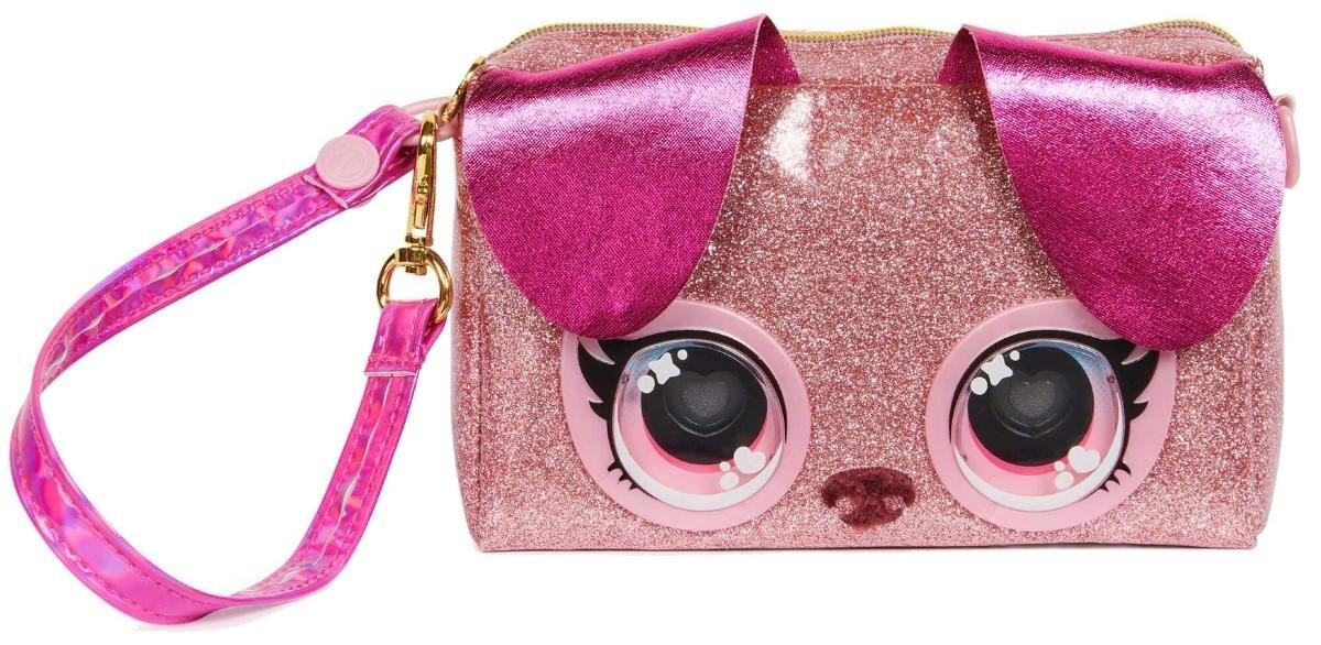 Эта милая маленькая сумочка представлена в розовом цвете. У него пара больших глаз, которые загораются разными цветами, если надавить на нос. У него также есть сверкающие розовые уши.