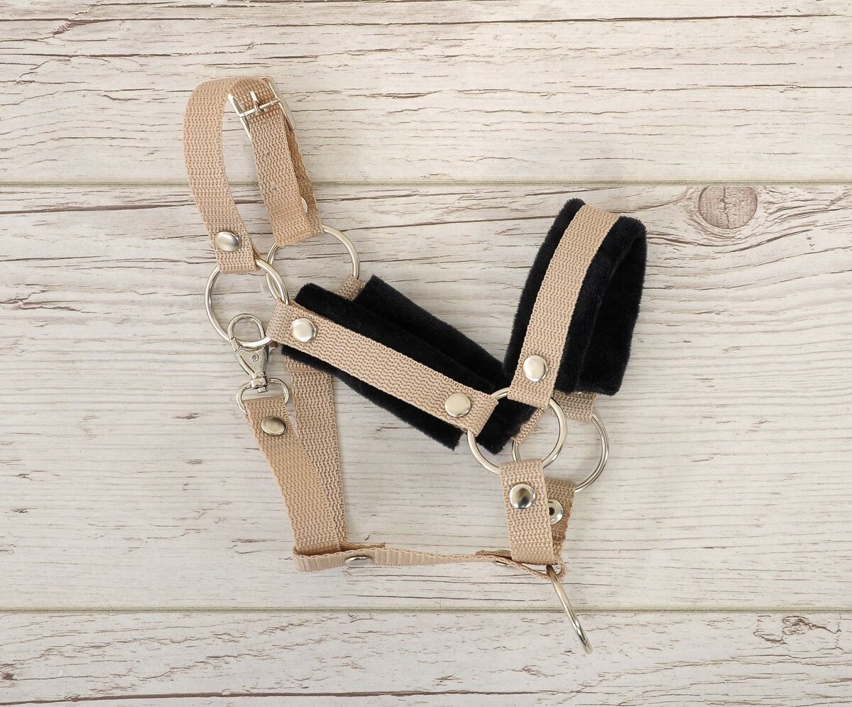 Практичный и прочный недоуздок на меху для коняка. Изготовлен из высококачественной прочной ленты шириной 1,5 см и мягкого норкового материала. Застежку можно отрегулировать по размеру лошади. Легко застегивается карабином. Металлические элементы бретеля - такие как кнопки, металлические кольца, регулируемая пряжка и карабин серебристого цвета.