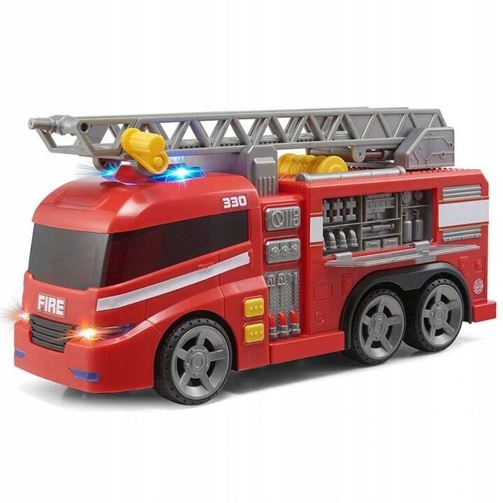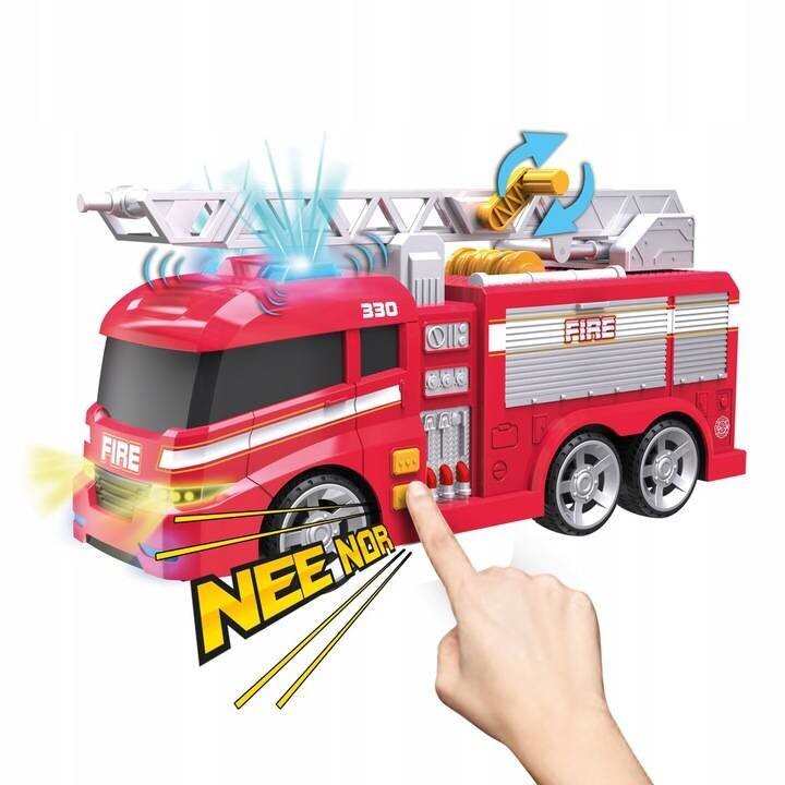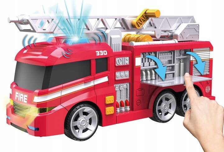 Большая пожарная машина, игрушка имеет подвижную лестницу для ручного вращения и открывающийся борт. Автомобиль также оснащен звуками и мигалками, а активируются они нажатием кнопок, расположенных сбоку автомобиля.