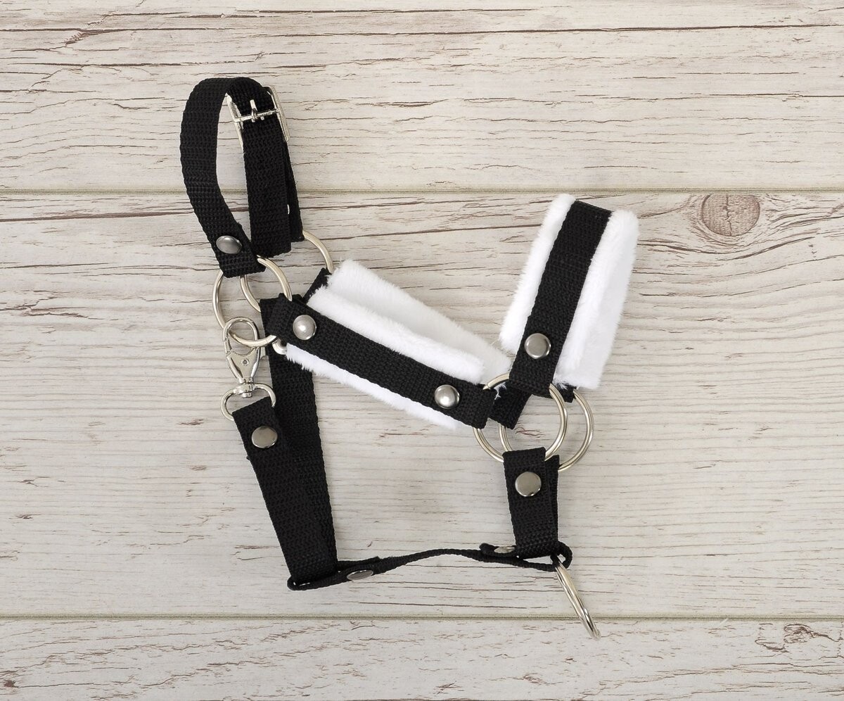 Практичный и прочный недоуздок на меху для коняка. Изготовлен из высококачественной прочной ленты шириной 1,5 см и мягкого норкового материала. Застежку можно отрегулировать по размеру лошади. Легко застегивается карабином. Металлические элементы бретеля - такие как кнопки, металлические кольца, регулируемая пряжка и карабин серебристого цвета.