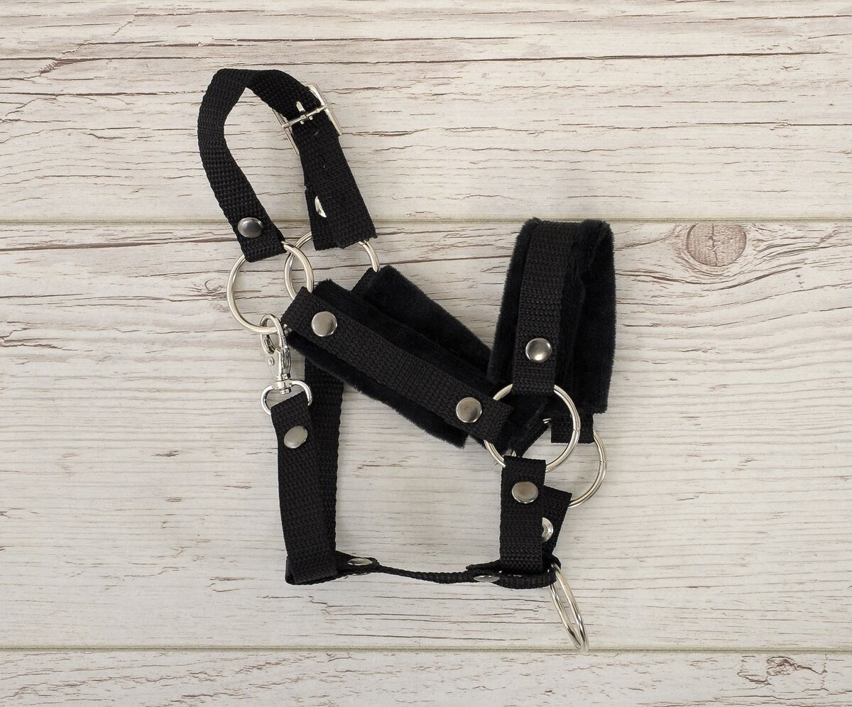 Практичный и прочный недоуздок на меху для коняка. Изготовлен из высококачественной прочной ленты шириной 1,5 см и мягкого норкового материала. Застежку можно отрегулировать по размеру лошади. Легко застегивается карабином. Металлические элементы бретеля - такие как кнопки, металлические кольца, регулируемая пряжка и карабин серебристого цвета.