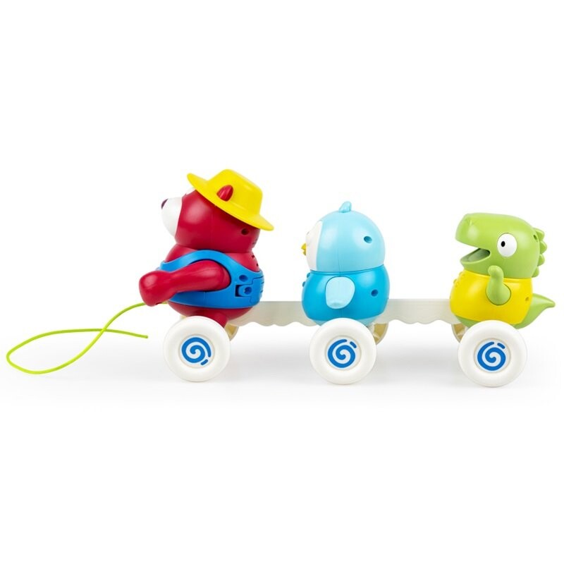 Поезд с тремя весёлыми пассажирами ждёт попутку! Игрушка оснащена веревочкой для направления ручки. Во время движения животные раскачиваются из стороны в сторону, как и колеса автомобиля, которые украшены узором, благодаря чему их движение создает интересный визуальный эффект. Потянув за веревочку, активируются забавные звуки и мелодии, которые сделают игру более увлекательной.