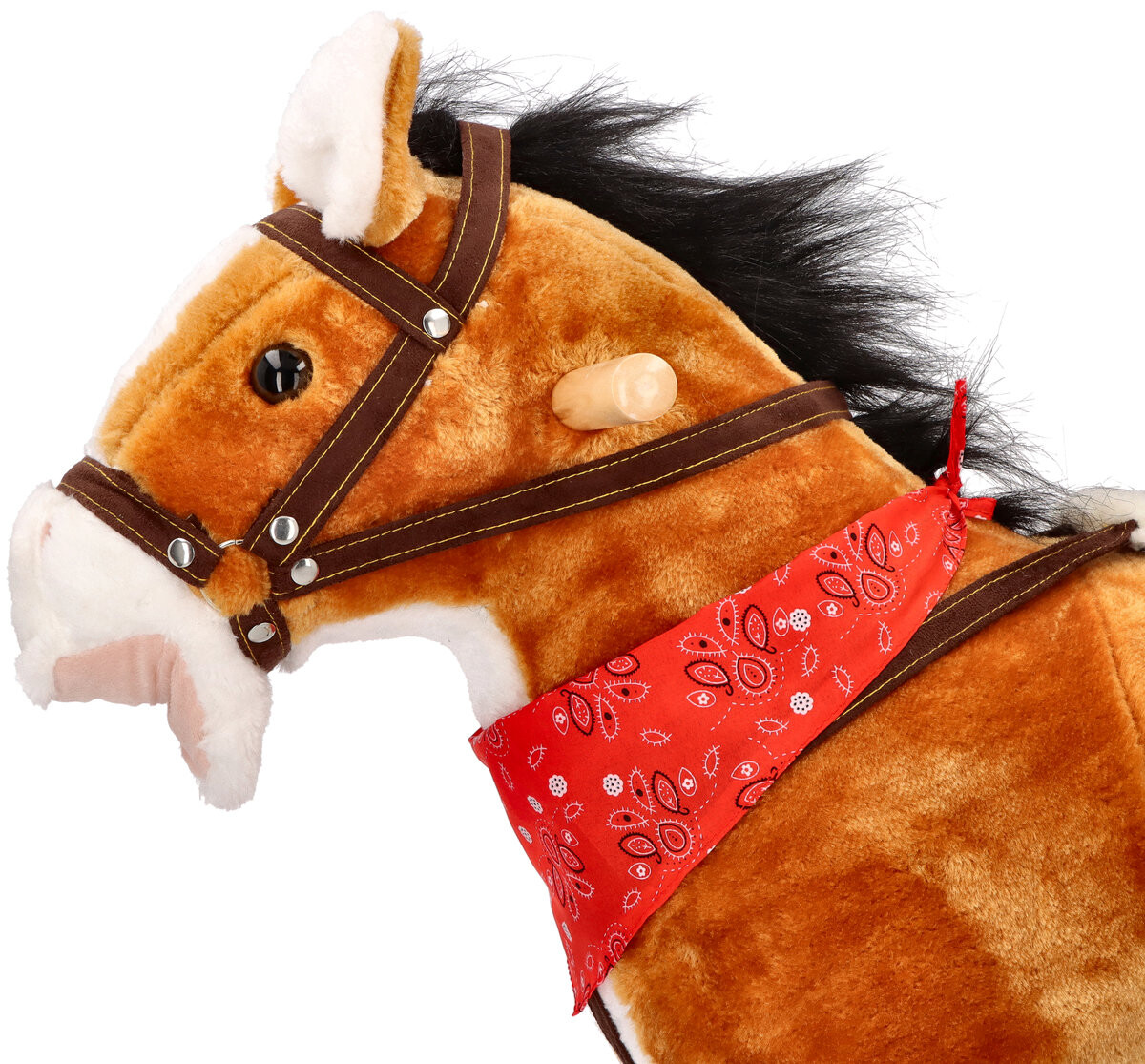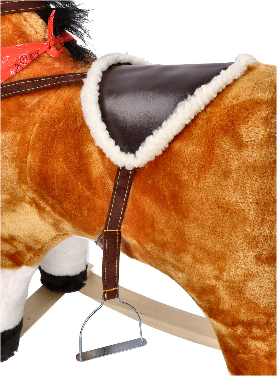 Красивая лошадка из армированного пенопласта с металлическим каркасом внутри станет любимой игрушкой вашего ребенка. Светло-коричневая лошадка с черным хвостом и гривой имеет деревянные полозья и ручки светлого цвета натурального дерева. Лошадь оснащена седлом из экологической кожи и поводьями, как у настоящей лошади. Кроме того, его шею гордо закрывает красный шарф. Это классическая лошадка-качалка, которую многие из нас помнят с детства.