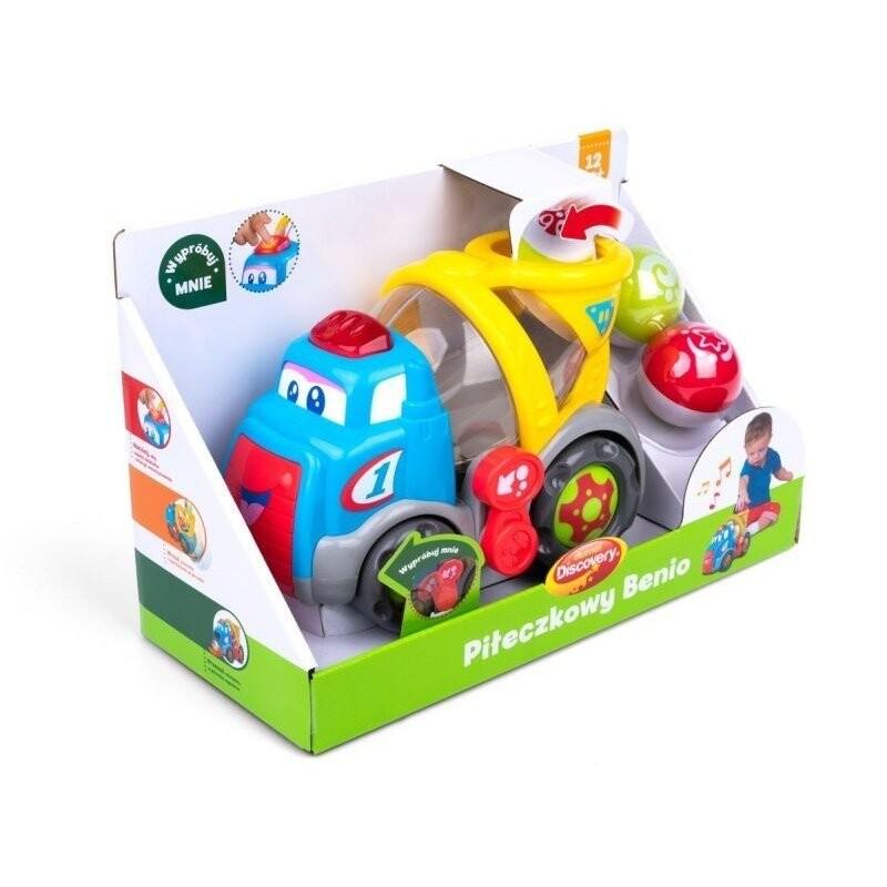 Познакомьтесь с улыбчивым другом на 4 колесах, который поет на польском и бросает мячики! Чтобы запустить песню, нажмите красную кнопку, расположенную на крыше автомобиля. Свободное движение колес позволяет управлять игрушкой рукой. Сбоку бетономешалки имеется хитрый рычаг. Переместите ее вперед, чтобы опустить створку, и смотрите, как Бенио бросает мяч!