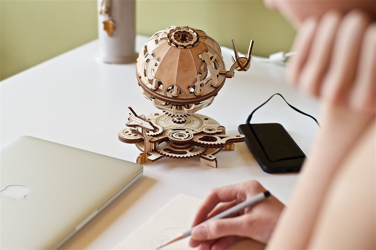 Глобус — простая в сборке модель, за которой очень интересно наблюдать в движении. Уникальный механизм и оригинальный стиль делают глобус креативным подарком и неповторимым украшением вашего дома или офиса. Это модель, к которой вам захочется возвращаться снова и снова. Возьмите его с полки и начните мечтать обо всех местах, которые вы когда-нибудь посетите.