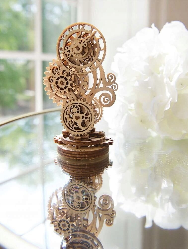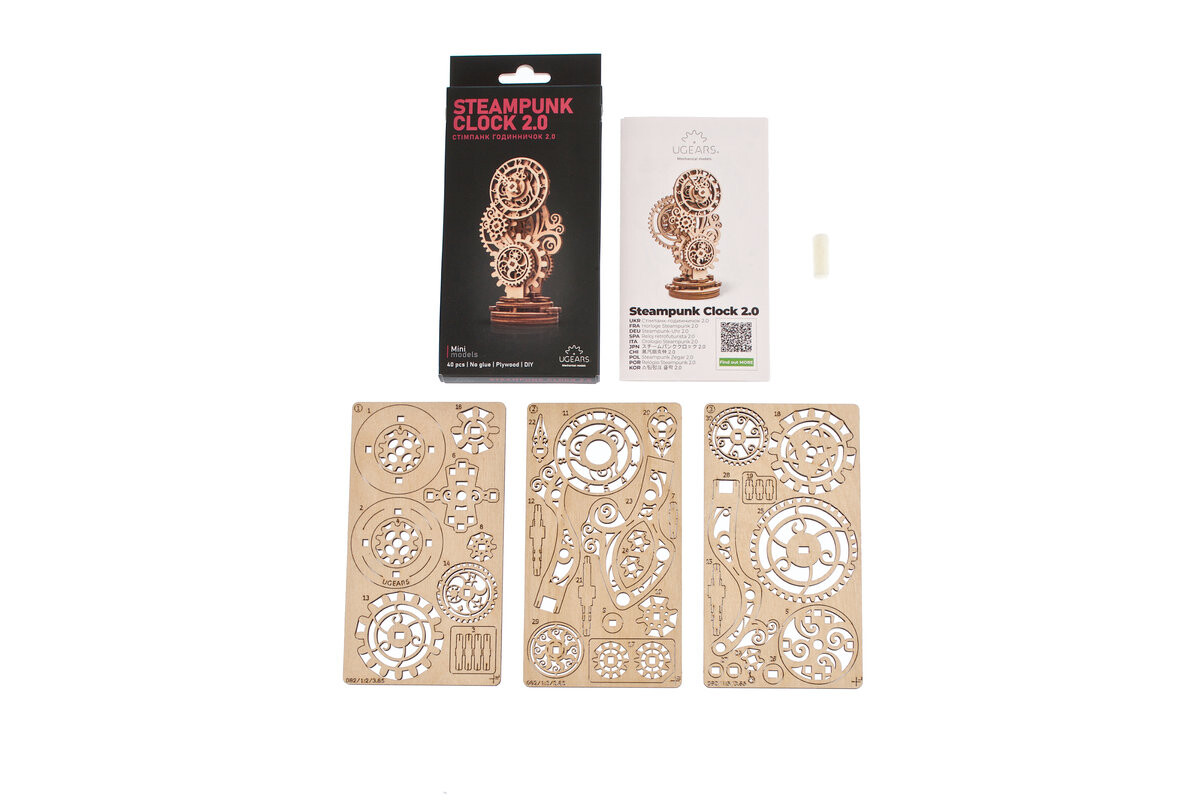 В комплект входит все что нужно для сборки. Сборка модели не требует клея или специальных инструментов. Часы в стиле стимпанк – отличный способ заинтересовать детей и взрослых увлекательным хобби. Пригласите своих друзей и семью в удивительный мир механики! Механизм модели состоит из шестеренок, которые оригинальным образом соединяются между собой под углом 90 градусов. Наблюдать за их движением будет настоящим удовольствием. Небольшой размер модели не позволяет включить в нее большое количество оригинальных механических узлов, однако инженеры Ugears оснастили часы в стиле стимпанк еще одной интересной особенностью: асинхронными стрелками часов на одной оси. Руки вращаются совершенно независимо друг от друга, каждая с разной скоростью. Модель представляет собой миниатюрную имитацию настольных часов с корпусом, украшенным искусной резьбой. оснащен интеллектуальным механизмом, который активирует стрелки на циферблате. Филигранная резьба на декоративных элементах модели выполнена в виде стилизованных растительных орнаментов и небесных тел: Солнца, звезд и Луны в различных фазах.