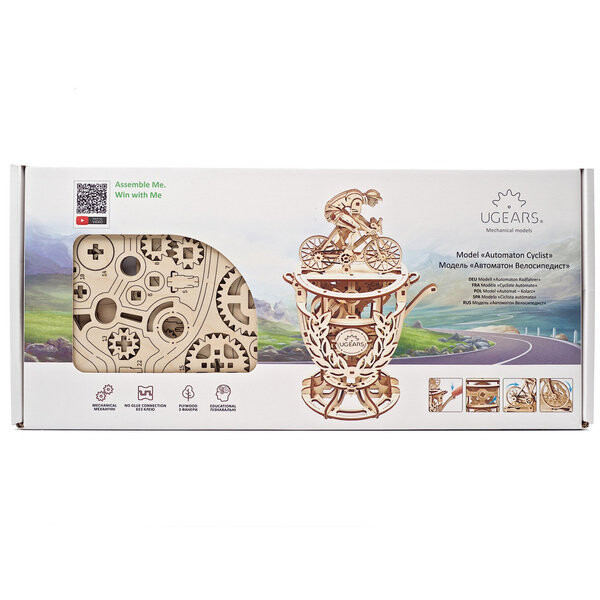 Ugears известна своим оригинальным подходом к деревянным механическим моделям, и на этот раз наши волшебники использовали простой маховик, чтобы создать все волшебство. Запустите модель, потянув за рычаг сбоку, и наблюдайте, как велосипедист начинает гонку.