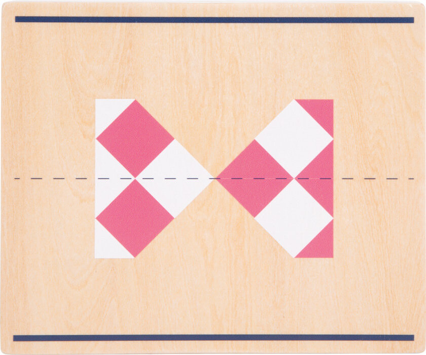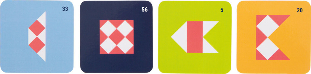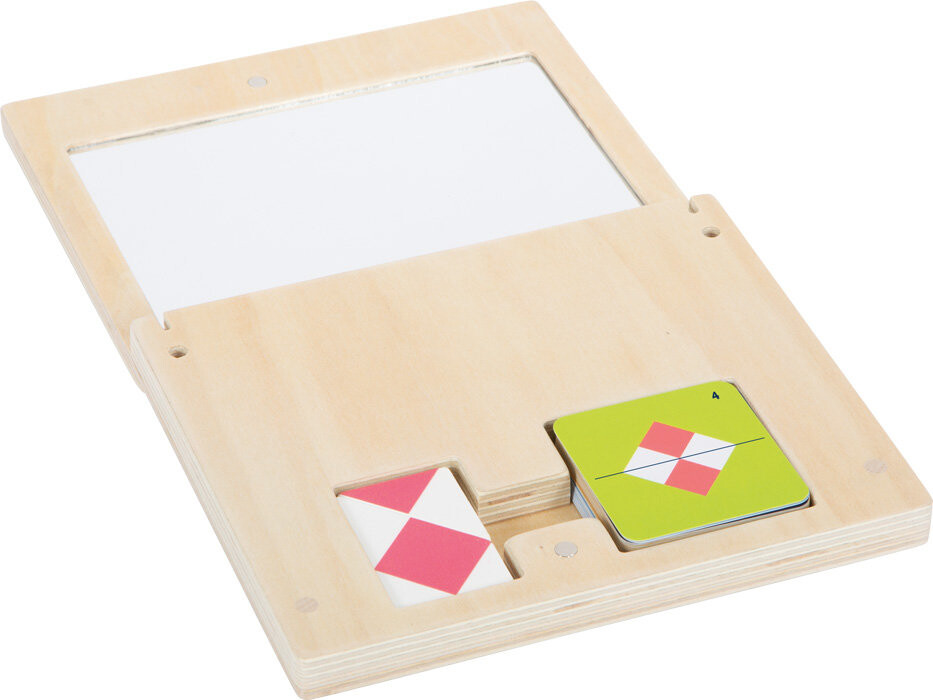 В набор входят 32 двусторонние карточки с узорами, которые необходимо расположить, используя имеющиеся фигуры и отражения в зеркало. Не позволяйте простоте игрушки ввести вас в заблуждение, ведь даже взрослым нужно некоторое время подумать, прежде чем найти правильное решение. Карты дополнительно разделены на 4 уровня сложности, по 16 картинок на каждом уровне.
