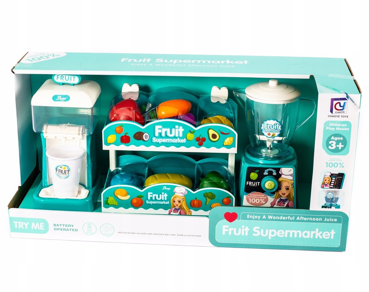 В комплект входит подставка для продуктов, блендер и машина для розлива фруктового сока.