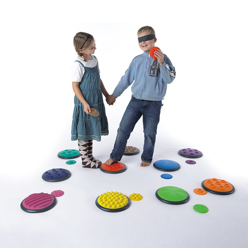 Каждый диск имеет разный цвет и текстуру поверхности. Дети могут трогать диски руками и ногами, развивая при этом умение распознавать формы и описывать сенсорные впечатления.