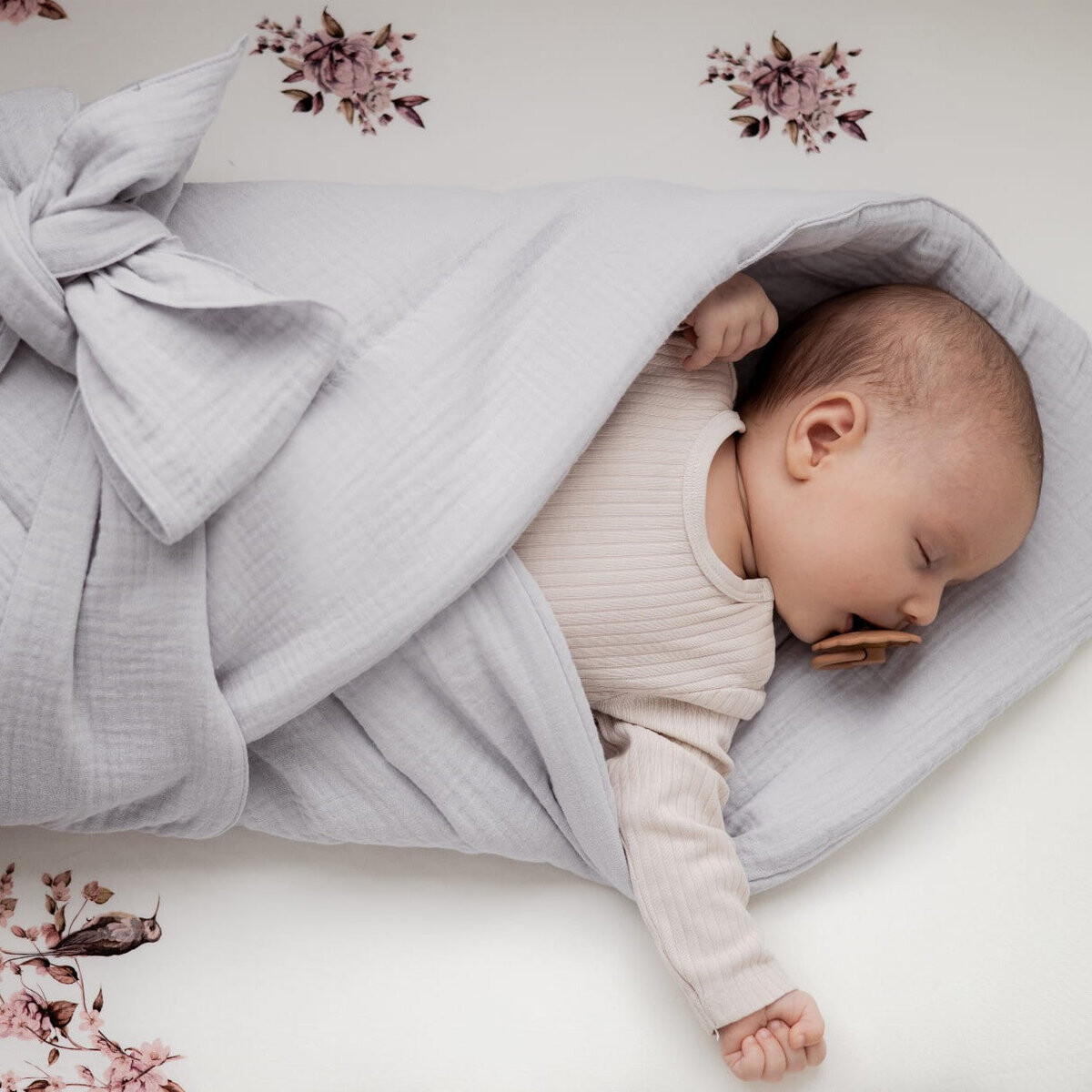 Муслиновая пеленка Rose от Sleepee с галстуком-бабочкой позволяет регулировать ее, завязывая ее туже или слабее.