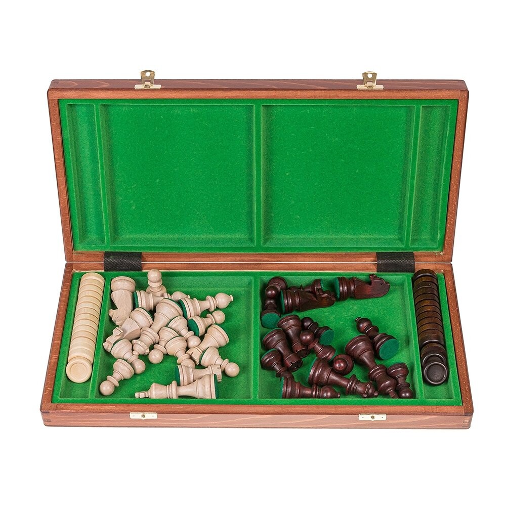 Шахматы + Шашки - XLШахматная доска изготовлена вручную методом маркетри по дереву: красное дерево/платанПолуглянцевый лак, центр заполнен изящной вставкой h4>Размеры кассеты: 472 x 472 ммВ сложенном виде 472 x 234 x 52 ммПлощадь: 50 х 50 ммШахматные фигуры, выточенные из дерева, покрытые лаком, оклеенные фетром - Staunton 5.Высота: по вертикали 45 мм - ладья 51 мм - слон 66 мм- конь 67 мм - ферзь 80 мм - король 91 ммНижняя часть фигур имеет утяжелители для улучшения устойчивости на шахматной доскеШашки: изготовлены из платана, покрыты лакомДиаметр: 29 мм