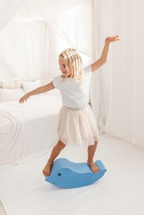 Игрушка «Дельфин» позволяет активно проводить время разными способами. Единственное, что нас ограничивает – это наше воображение. Игрушку можно использовать как обычную качалку: ребенок садится на дельфина и держится руками за ручки. Также можно повысить уровень сложности и, отсоединив ручки, попытаться сохранить равновесие, стоя на дельфине. Перевернув его вверх дном, дельфин может удлинить его, чтобы он стал частью пути, по которому он должен пройти. На перевернутом дельфине малыш может лежать на животике, а при размещении на боку он может выполнять роль сиденья.