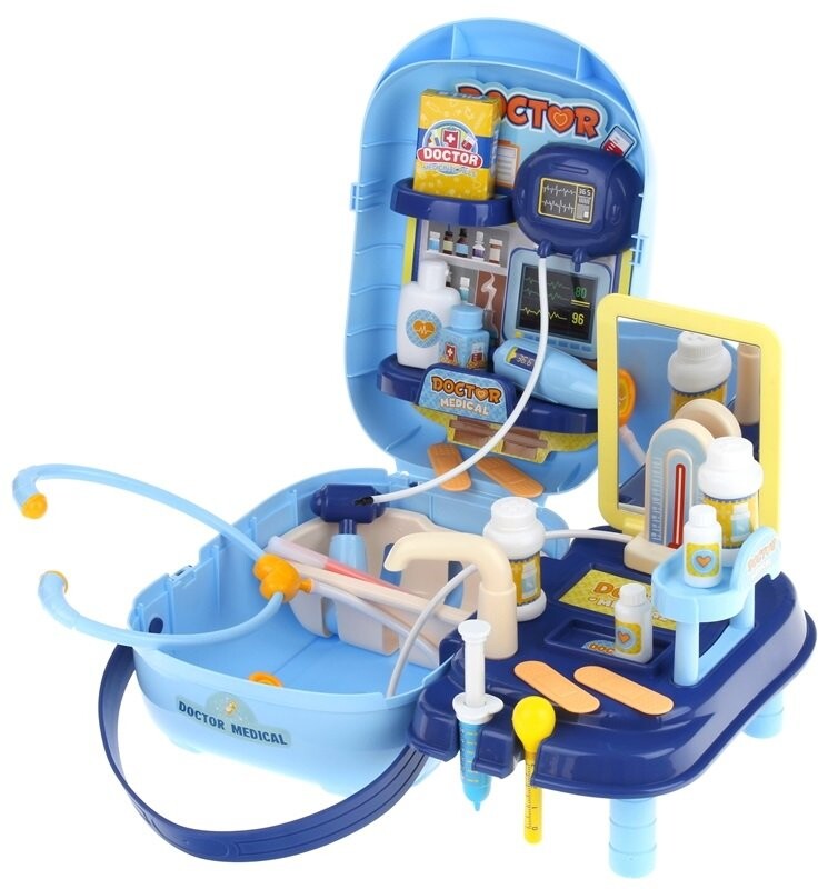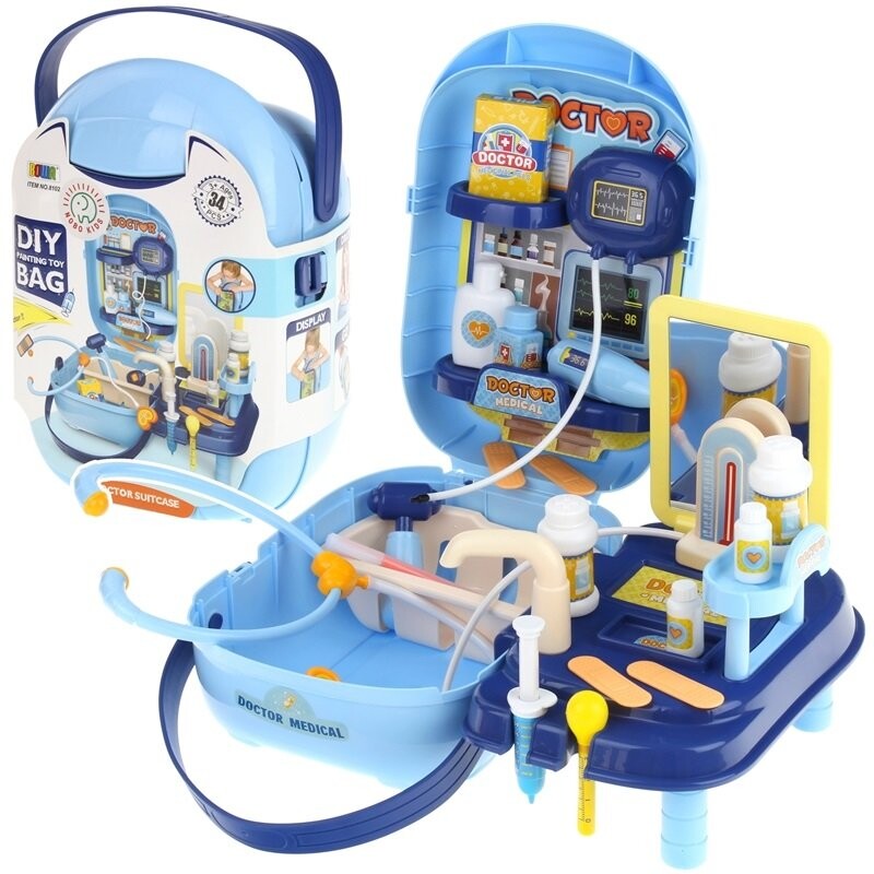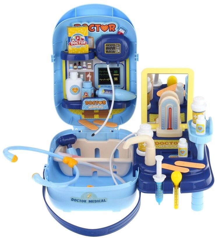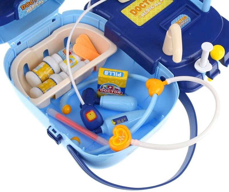 Медицинская аптечка – это предложение для каждого ребенка, который хочет научиться оказывать первую помощь. Набор хорошо оснащен, что делает его пригодным для многих медицинских ситуаций. Набор упакован в практичный чемодан. что позволит вам взять все инструменты на следующий визит к пациенту. В разложенном виде чемодан превращается в настоящий кабинет врача. На чемодане под пластиковым окном можно разместить записку с рисунком или надписью, созданной вашим ребенком.
