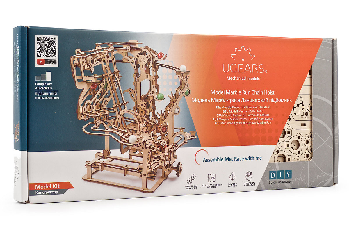 Это нарезанные деревянные доски, 10 шариков, воск и наждачная бумага (для оптимальной работы механизма). К каждой модели Ugears, 3D-пазлу или головоломке прилагается подробная иллюстрированная инструкция на 11 языках. Цепная таль Marble Run состоит из 400 элементов, имеет среднюю сложность, расчетное время сборки составляет 7 часов.