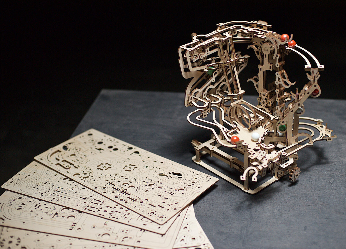 Вы и ваша семья проведете часы удовольствия, собирая этот конструктор без использования клея или специальных инструментов. Просто снимите деревянные элементы с досок, вырезанных лазером, а затем прижмите их на место. Вы увидите, как обретает форму ваша дорожка для мяча.