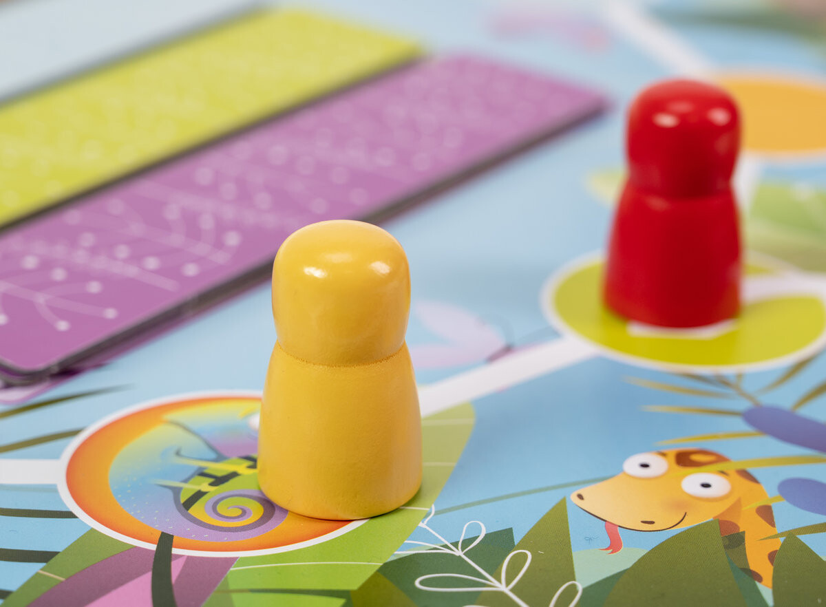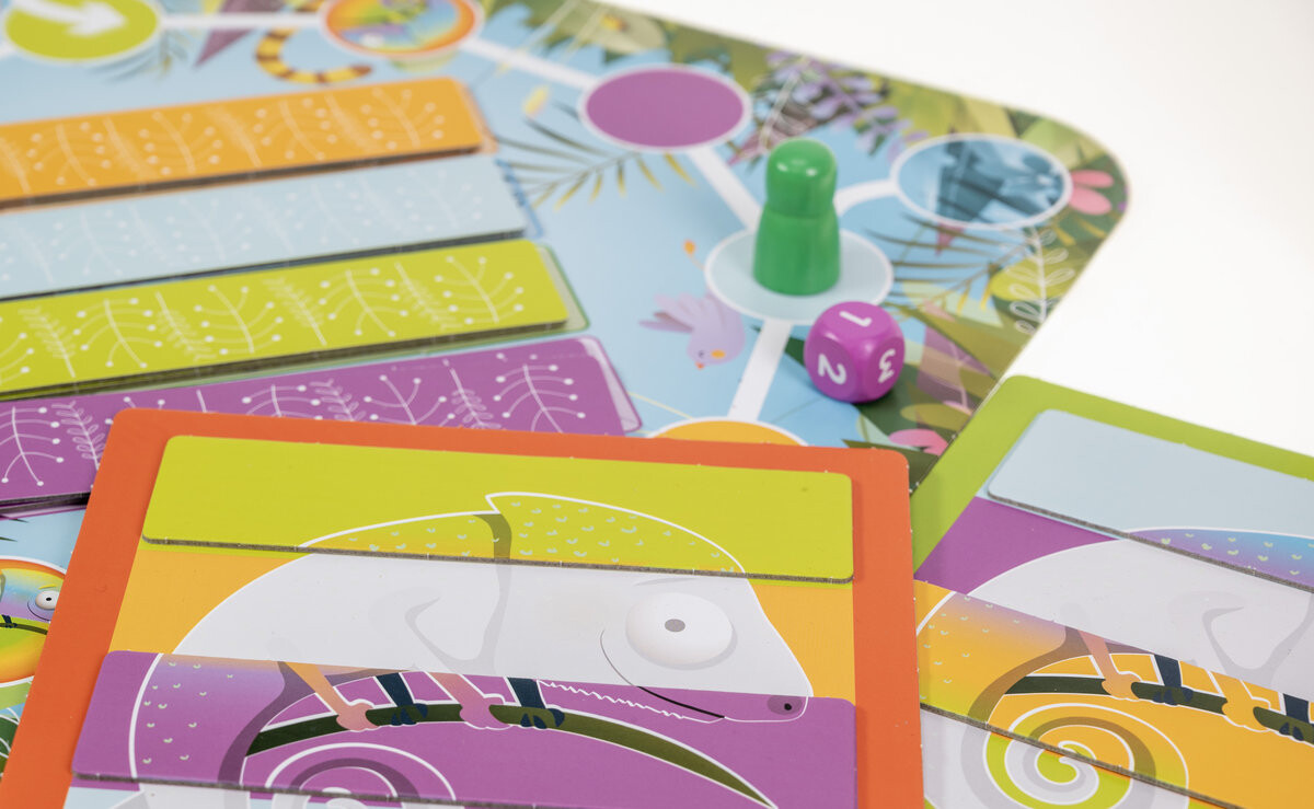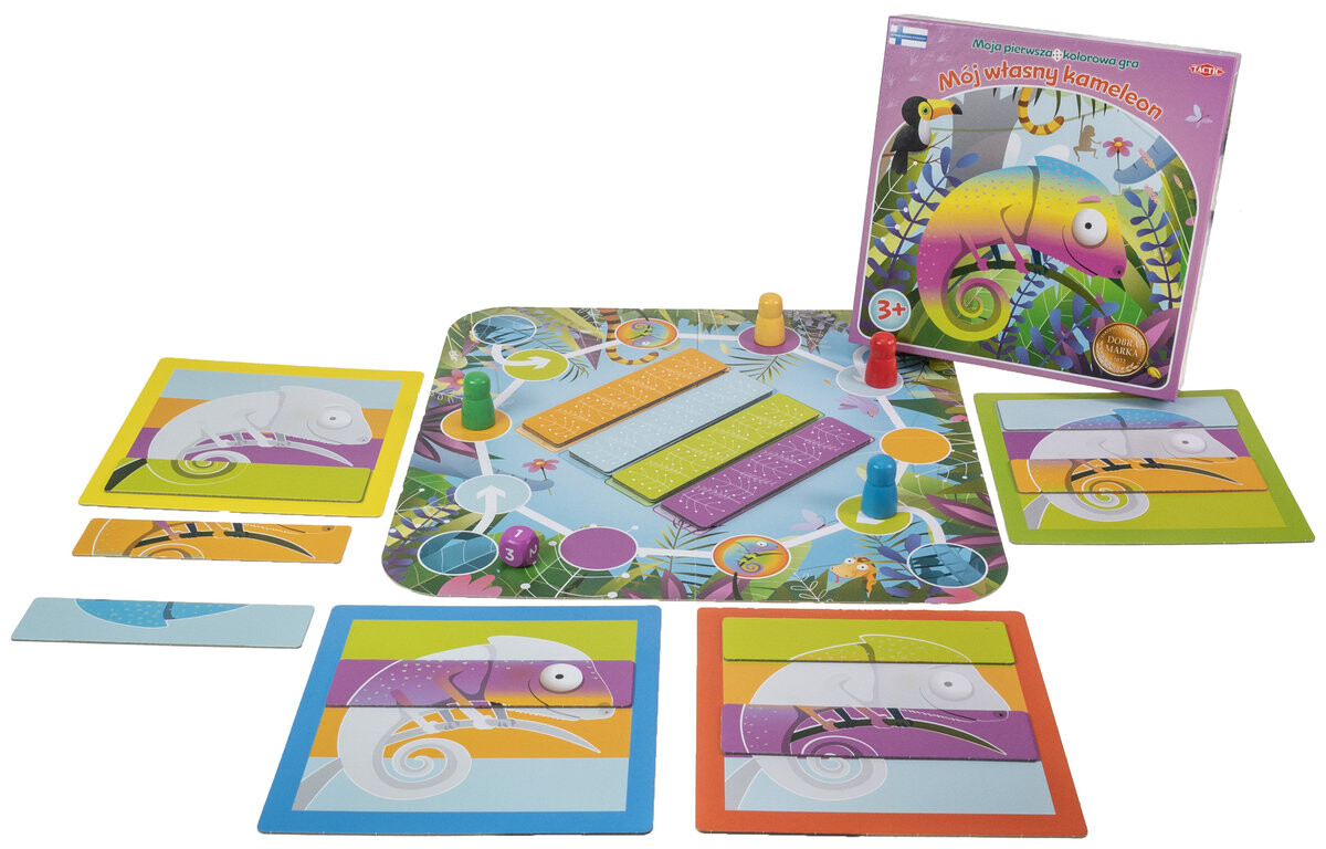 Моя первая красочная игра! Хамелеоны так долго дремали, что их цвета полностью поблекли... Помогите хамелеонам найти и вернуть их. Бросайте кости, перемещайтесь по игровому полю и постарайтесь найти подходящие цвета для своего хамелеона! В этой восхитительной игре для детей вас ждут большие деревянные пешки и деревянные игральные кости. Размер доски в собранном виде — 56х55 см. Изделие сертифицировано FSC и изготовлено по технологии Zero Plastic. В комплекте: игровое поле, 4 доски-хамелеона, 16 цветных полосок, 4 пешки, кубик, инструкция. Игра для 2-4 игроков от 3 лет.