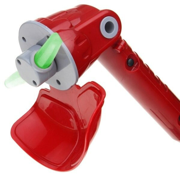 Чтобы начать играть, нажмите кнопку на внутренней стороне ручки. Нажатие на нее заставит прозрачное резиновое лезвие вращаться и светиться зеленым. Веселье разнообразят звуки, характерные для работы двигателя и стрижки травы. Лезвие было отделено защитной крышкой, служащей для регулировки угла наклона лезвия. Телескопическая трубка, на которой крепится лезвие. у него есть кнопка, позволяющая регулировать его длину.