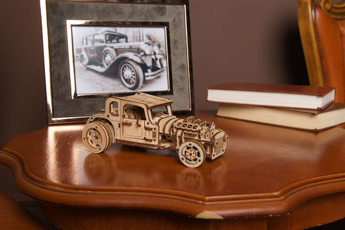 В этой модели используется функциональность двойного двигателя: вы можете заводить мотор пружинусделав шесть полных оборотов специальным ключом. или вы можете просто потянуть Хот-род назад по ровной поверхности, затем замедлиться и посмотреть, как машина ускоряется - точно так же, как если бы вы делали это с любой игрушечной машинкой с полным приводом. Автомобиль оснащен множеством деталей, которые добавляют ему реалистичности, например: уникальный масштаб, детали двигателя и салона, а также двойные двери с механизмами замка и ручки. Вы можете оставить его в цвете натурального дерева или перекрасить в любую цветовую конфигурацию.