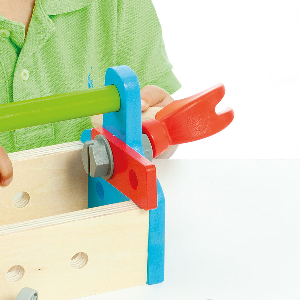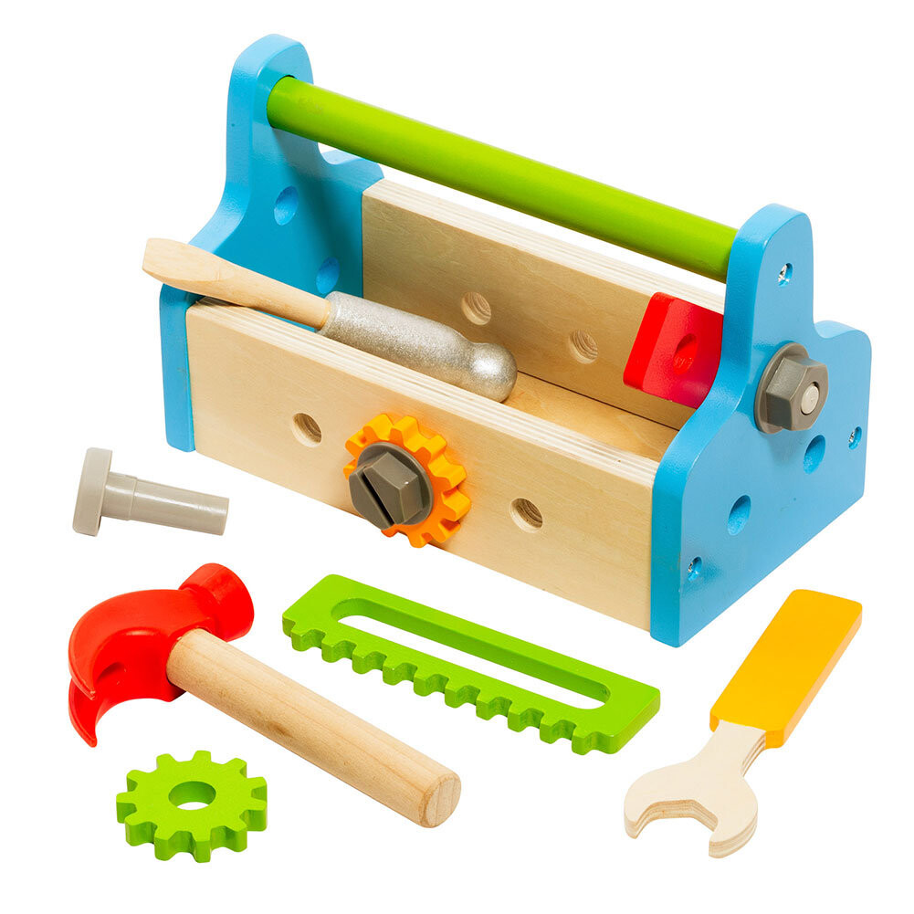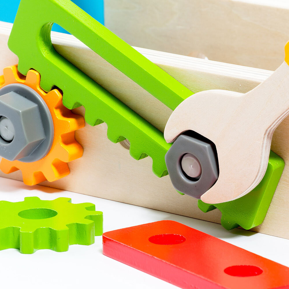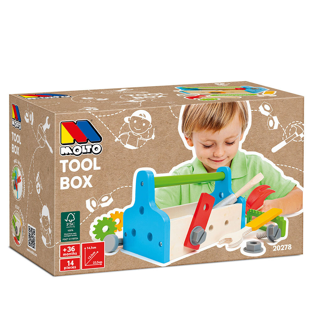 Ящик с деревянными игрушечными инструментами со всевозможными аксессуарами, гайками, болтами, молотком, отверткой и ключом для завинчивания, отвинчивания, забивания и снятия гаек. Все аксессуары находятся в практичном деревянном ящике, поэтому все инструменты можно хранить и переносить. Идеальный набор для маленького любителя DIY. Наши деревянные игрушки изготовлены в соответствии с требованиями FSC с использованием отборных экологически чистых материалов и экологически чистого производственного процесса. Деревянные игрушки Molto Nature расписаны вручную нетоксичными красками на водной основе и соответствуют самым строгим стандартам безопасности. Игрушка для детей от 3 лет.
