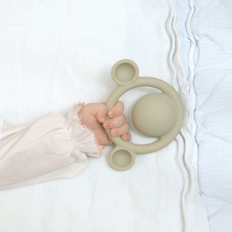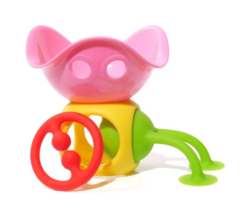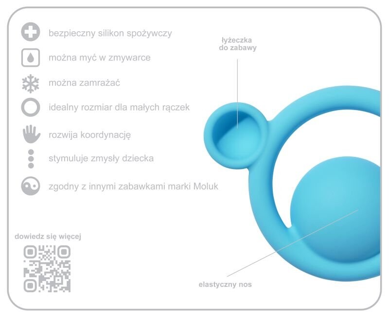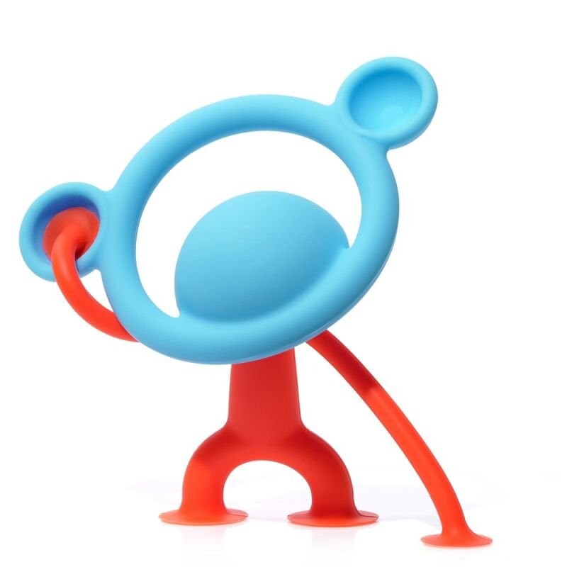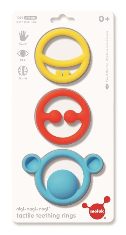 Кольца легко брать в руки маленькими ручками. Благодаря своей уникальной форме и ярким цветам они обеспечивают тактильную и визуальную стимуляцию. Синий прорезыватель имеет внутри выступ, на который можно нажимать, и 2 «щупальца», которые можно использовать как ложечки для кормления.