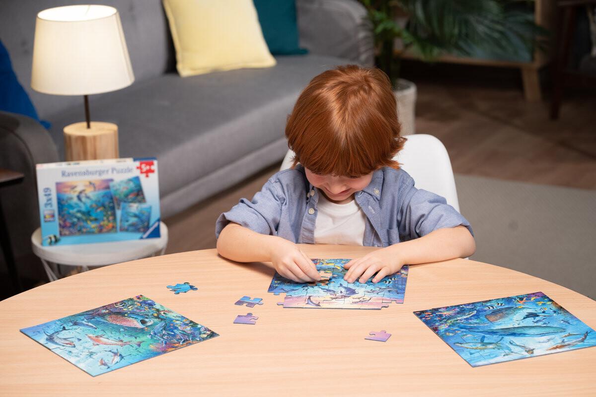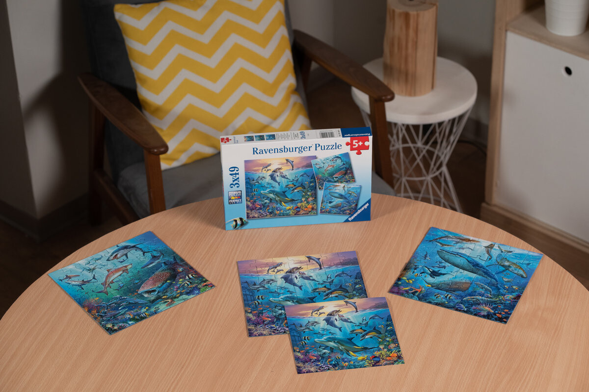 Содержимое коробки:3 головоломки из 49 деталей на тему «Водная жизнь».