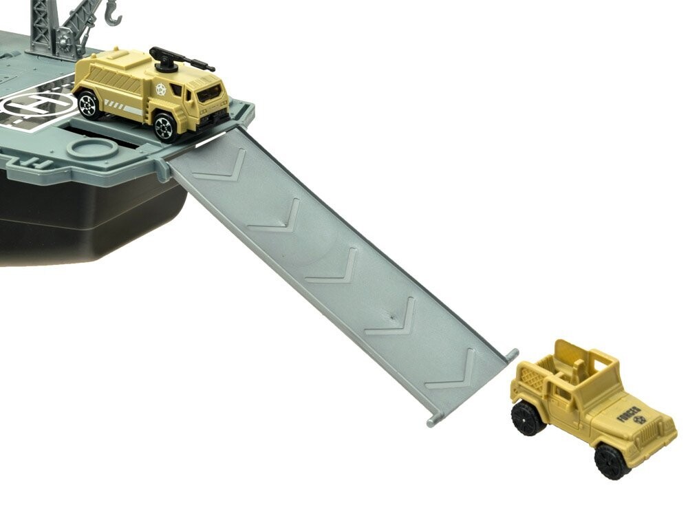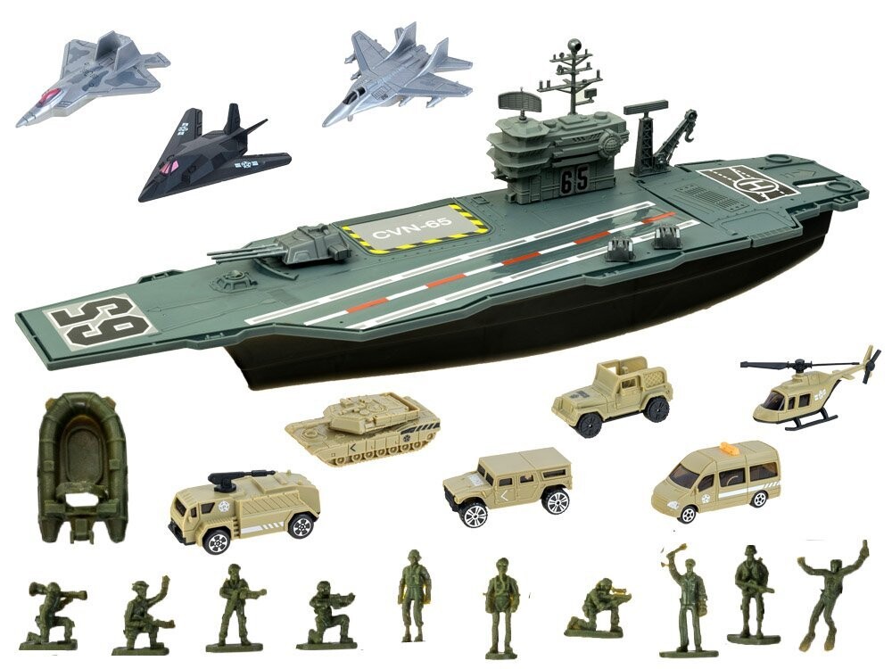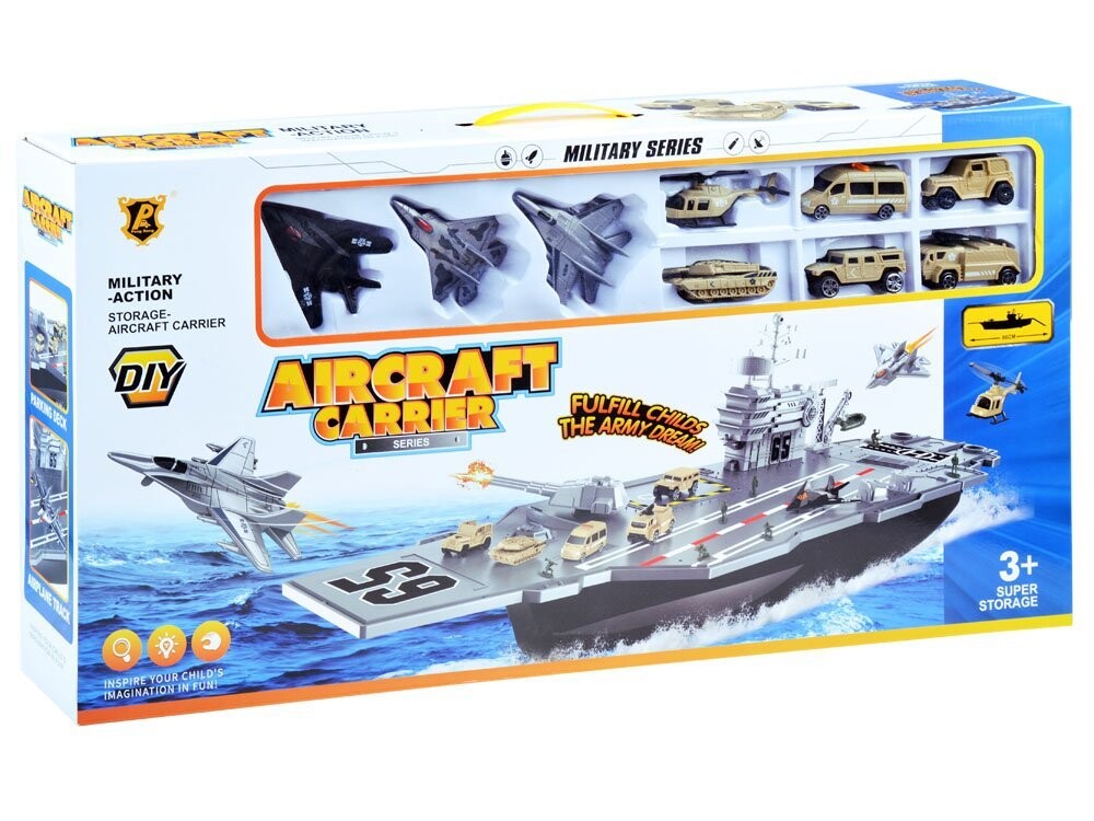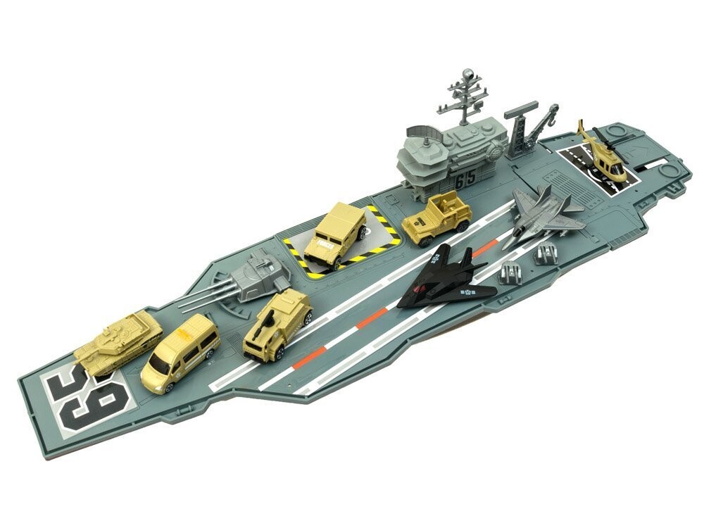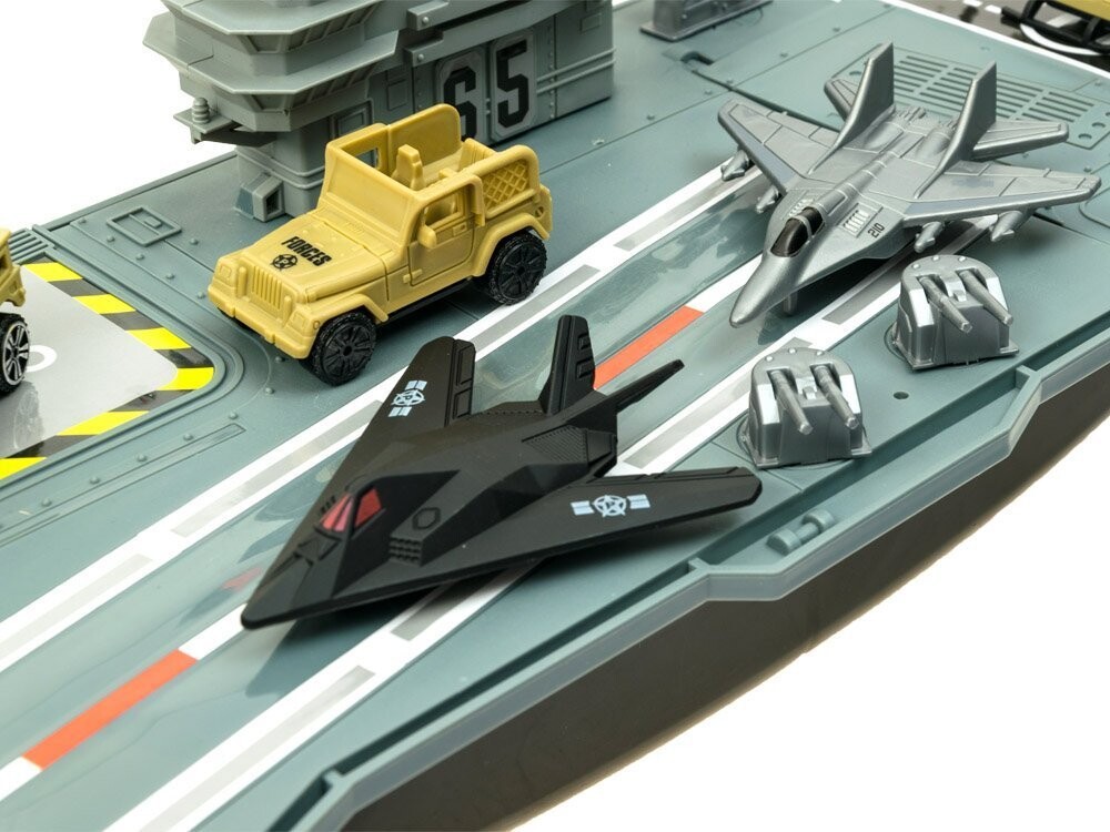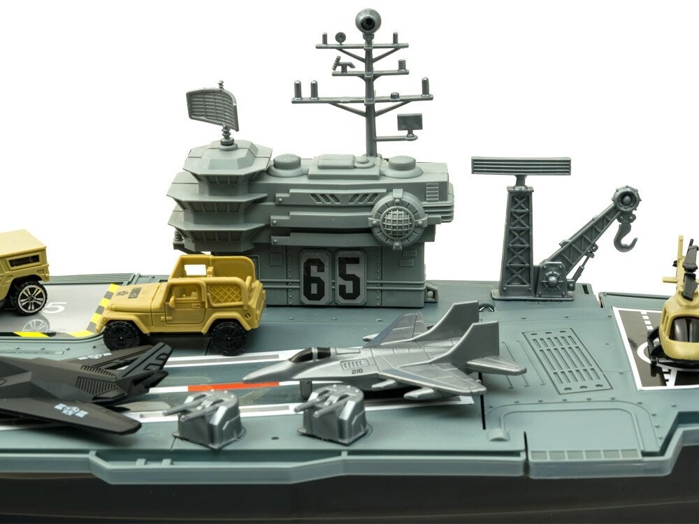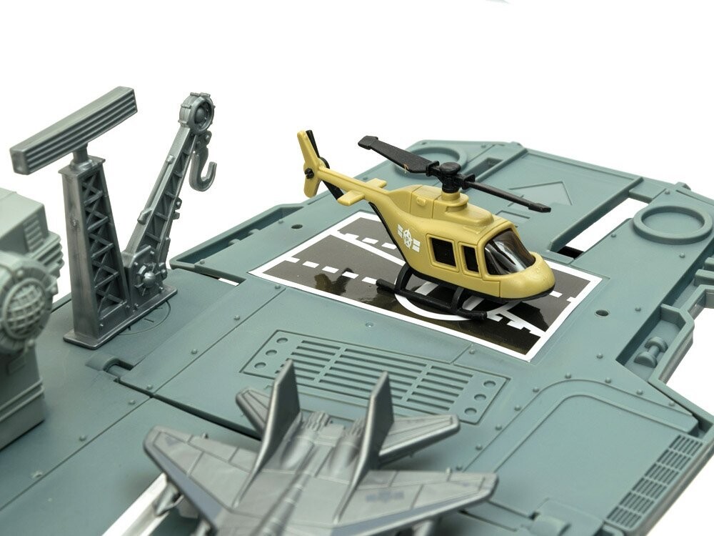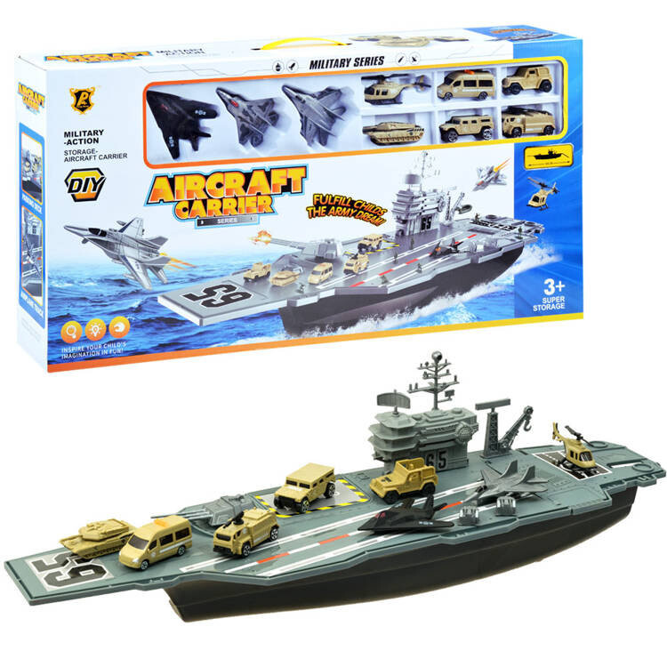 Огромный авианосец – настоящая находка для ценителей военной техники. Авианосец со своим штатом военных самолетов и военной техники, наверное, порадует каждого маленького, а возможно и большого любителя военной техники. Авианосец, как и реактивные самолеты и военная техника, выполнен из пластика, очень эстетично и аккуратно. Внутри есть отсек для неиспользуемых аксессуаров.