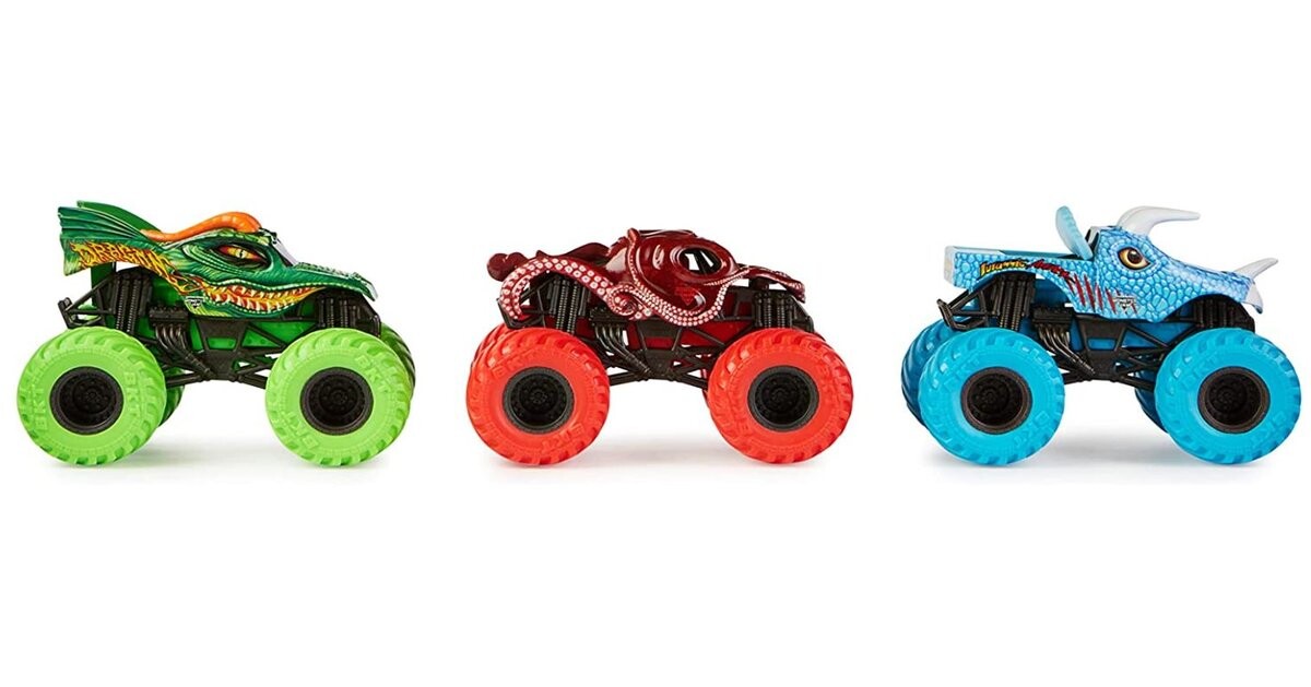 3 грузовика Monster Jam в одной упаковке! Эти автомобили в масштабе 1:64 будут доминировать над всем на своем пути! Машины Monster Jam оснащены официальными шинами BKT, стилизованными дисками и аутентичным шасси! Идеальное воспроизведение оригинальных автомобилей перенесет вас в мир этих ужасающих грузовиков-монстров! Все они имеют потрясающую графику и детализацию. В комплект входят 3 машины-монстра: Octon8er, Jurrasic Attack и Dragon. Приглашайте друзей играть вместе и соревноваться на арене! Кто из этих зверей выйдет победителем?