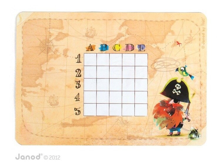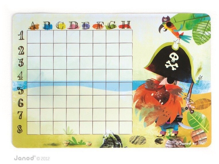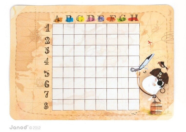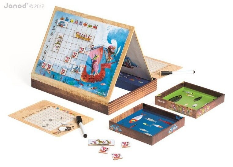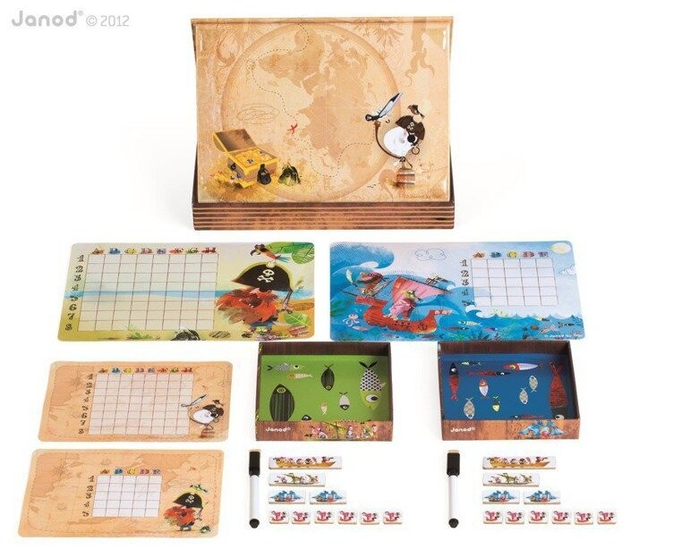 Вместо бумаги и карандаша инновационное решение — прекрасно иллюстрированные корабли в виде магнитов, которые размещены на двух магнитных досках с пиратским мотивом. У каждого игрока есть 10 корабельных магнитов.