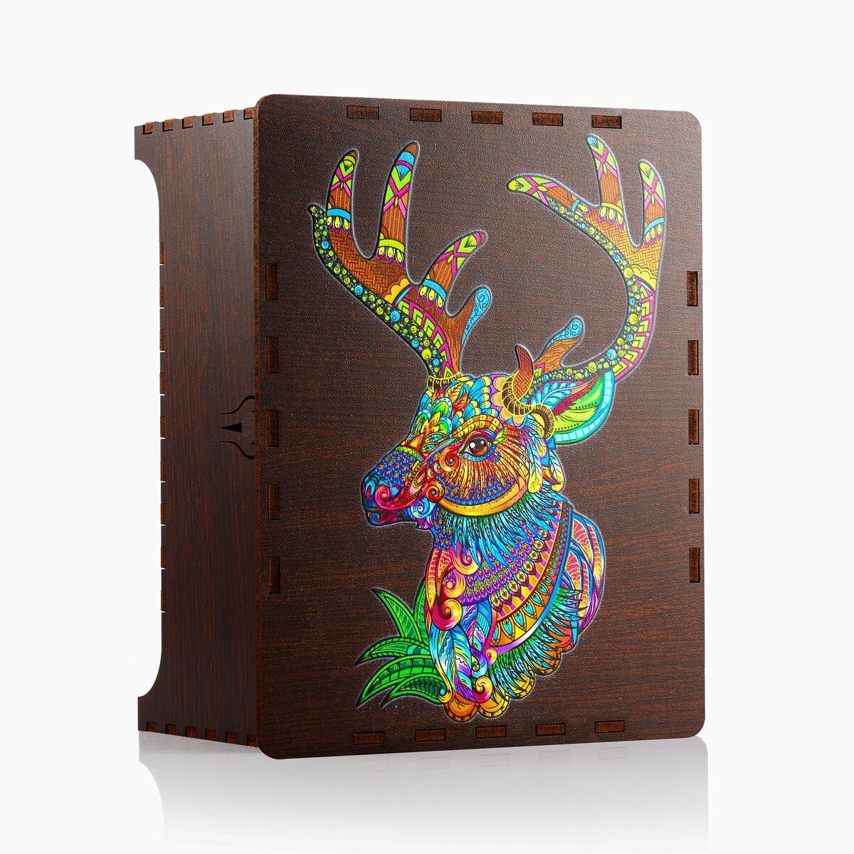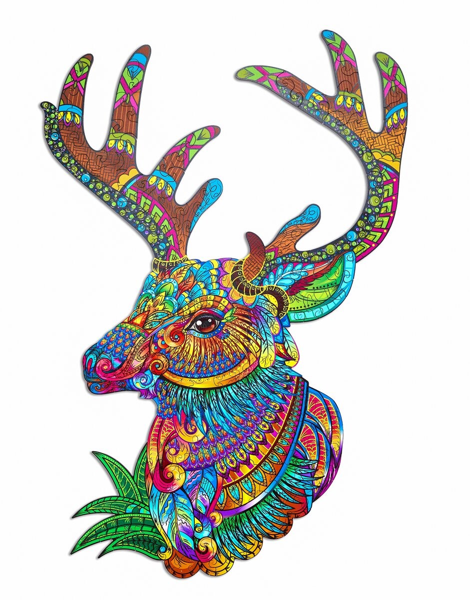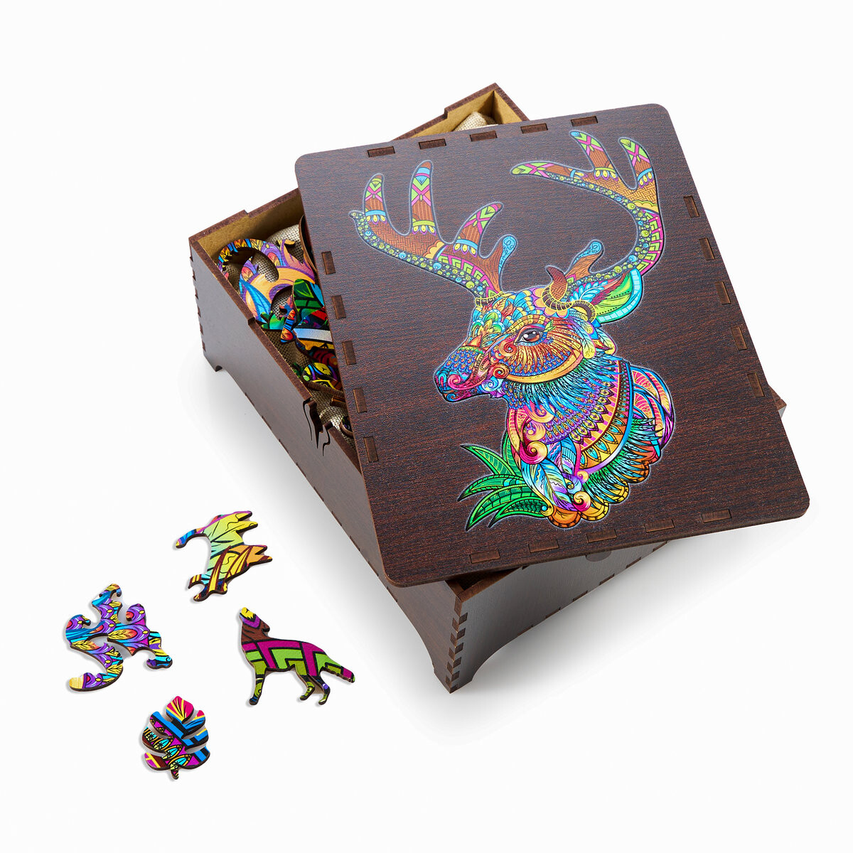 Набор деревянных пазлов на который не распространяются классические правила решения - у пазлов нет рогов и классических концовок. Их оригинальность заключается в форме рисунка – при расстановке появляется силуэт красочного оленя.Характеристики комплекта: