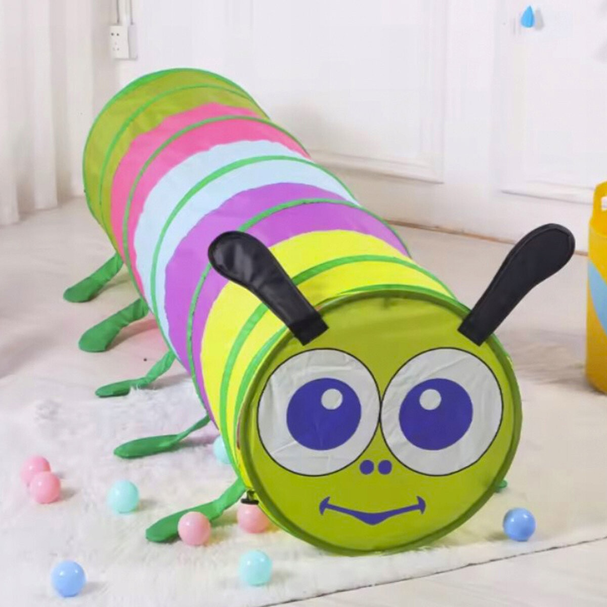 Туннель можно закрепить крючками. Затем создается извилистый туннель для игры. Сумка с ручкой для хранения