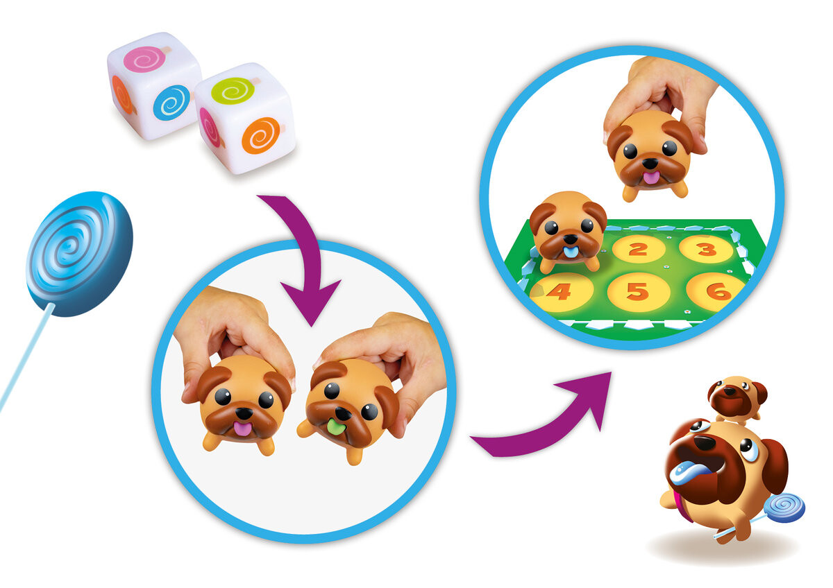 Нет! Стая непослушных мопсов съела все леденцы. К счастью, их языки окрашены в цвет леденца, который они съели! Вот как мы можем легко распознать всех негодяев. Ты мне поможешь? Возьмите собак и проверьте, соответствует ли цвет их языков леденцам, которые вы ищете. Побеждает тот игрок, который найдет больше всего мопсов.