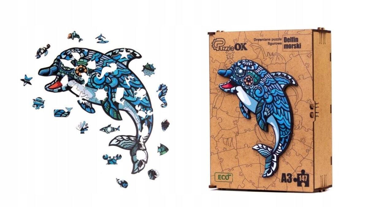 Деревянный пазл (Дельфин). Пазл состоит из 147 элементов интересных и необычных форм (например, предметов, организмов). После компоновки мы получим животное, составленное из красочных узоров и графических мотивов. Пазл не будет иметь классическую прямоугольную форму – он будет отражать форму данного животного. При создании стоит учитывать графику из коробки. Все элементы упакованы в деревянную коробку, которая защищает элементы внутри. Изделие может стать оригинальным украшением нашей комнаты.