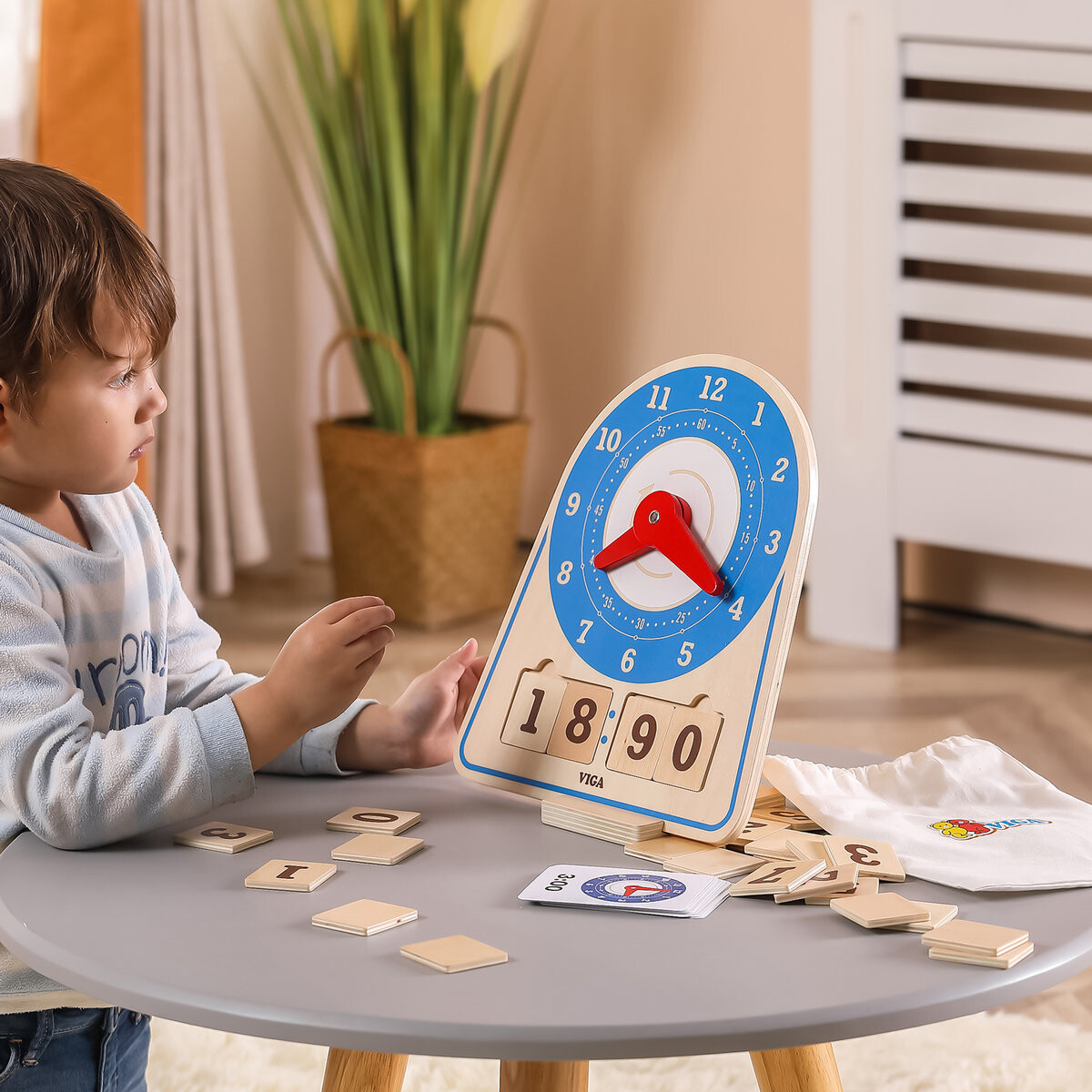 Деревянные часы для изучения часов и времени от известного и уважаемого бренда Viga — отличный пример того, как мы можем весело и с пользой провести свободное время с нашими детьми. Это стоячая игрушка, в комплект которой входят 12 карточек с инструкциями. Сверху расположен механический циферблат, а снизу — электронные часы. Ребенок может выучить часы по карточкам, а может установить время сам. Через игру ребенок развивает зрительно-моторную координацию и развивает способность логически мыслить. В комплект входит экологическая сумка, в которой можно легко хранить дополнительные аксессуары. Продукт предназначен для детей старше 3 лет. Все сделано из лакированного дерева и окрашено нетоксичными красками в яркие цвета. который удовлетворит каждого пользователя и доставит массу удовольствия. Помогите детям узнать время с помощью деревянных часов! !
