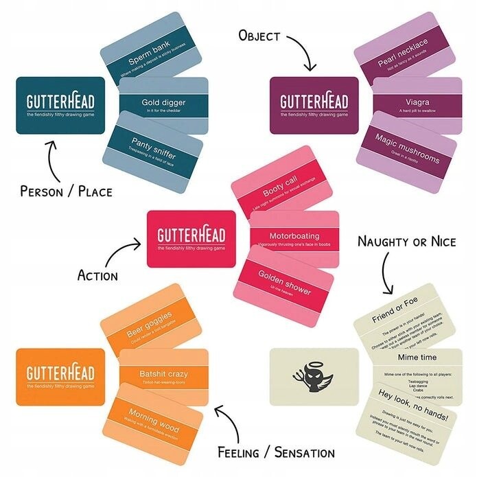 В веселой игре для вечеринок Gutterhead вам предстоит рисовать, имитировать и отгадывать более 240 чертовски грязных слов и фраз.