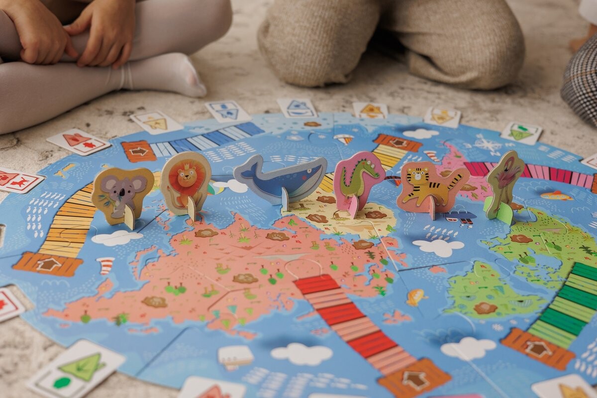 Работая вместе со всеми игроками, вы должны найти спрятанных животных* и доставить их в соответствующую часть мира/континента, следуя информации на карточках животных и следуя соответствующим маршрутам.