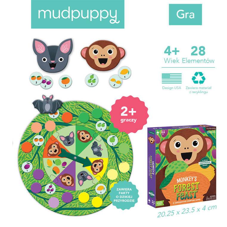 Игра Monkey's Forest Feast от американского бренда MUDPUPPY состоит из круглой доски с вращающейся стрелкой, 2 жетонов персонажей: обезьяны и летучей мыши, 24 жетонов фруктов, 1 жетона с маленькой летающей летучей мышью, инструкций и карточки диковинок. . Задача игроков — накормить обезьяну 10 тропическими овцами раньше, чем это сделает летучая мышь. В свою очередь каждый игрок вращает стрелку, а затем выполняет задания на поле, где она останавливается. Игра учит сотрудничеству, планированию и концентрации, а также: различению цветов и счету до 10. Это отличное развлечение как для детей, так и для взрослых (участвовать могут 2 и более человек).
