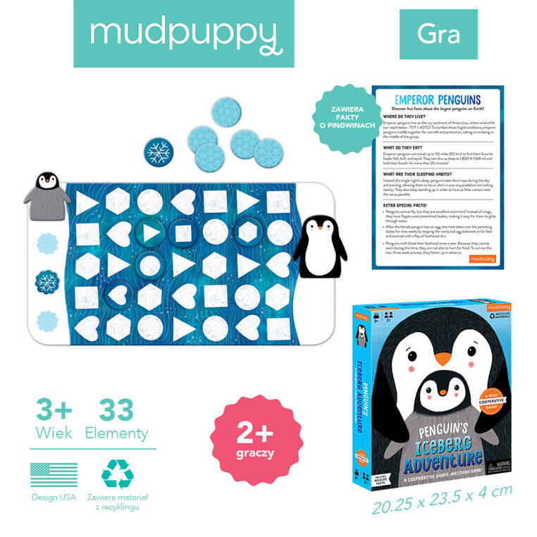 Игра «Пингвины на айсберге» от американского бренда MUDPUPPY состоит из доски с водной переправой между двумя айсбергами, 2 фигурок пингвинов: мамы и маленького пингвина, 29 жетонов льдин геометрической формы (например, кругов, треугольников, сердечек) , 1 жетон снежка, инструкции и карточка с викторинами. Задача игроков — провести малыша к матери по тропинке из кусочков льдины — каждый игрок в свою очередь раскрывает один жетон и размещает его на льдине соответствующей формы, чтобы наконец создать безопасный проход. Будьте осторожны и не вытяните жетон снежка, поскольку он предвещает метель. Игра учит сотрудничеству, планированию и концентрации внимания. Это очень весело для обоих детей а также взрослые (в нем могут принять участие 2 и более человек).