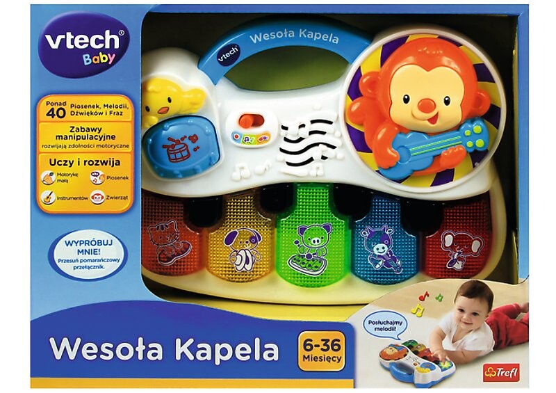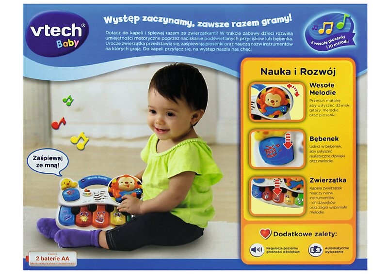 Wesoła Kapela, как и каждая игрушка Vtech, была изготовлена с величайшей тщательностью. Для его производства мы использовали комплектующие самого высокого качества. Мы усовершенствовали каждую деталь чтобы обеспечить вашему ребенку безопасное и развивающее развлечение.